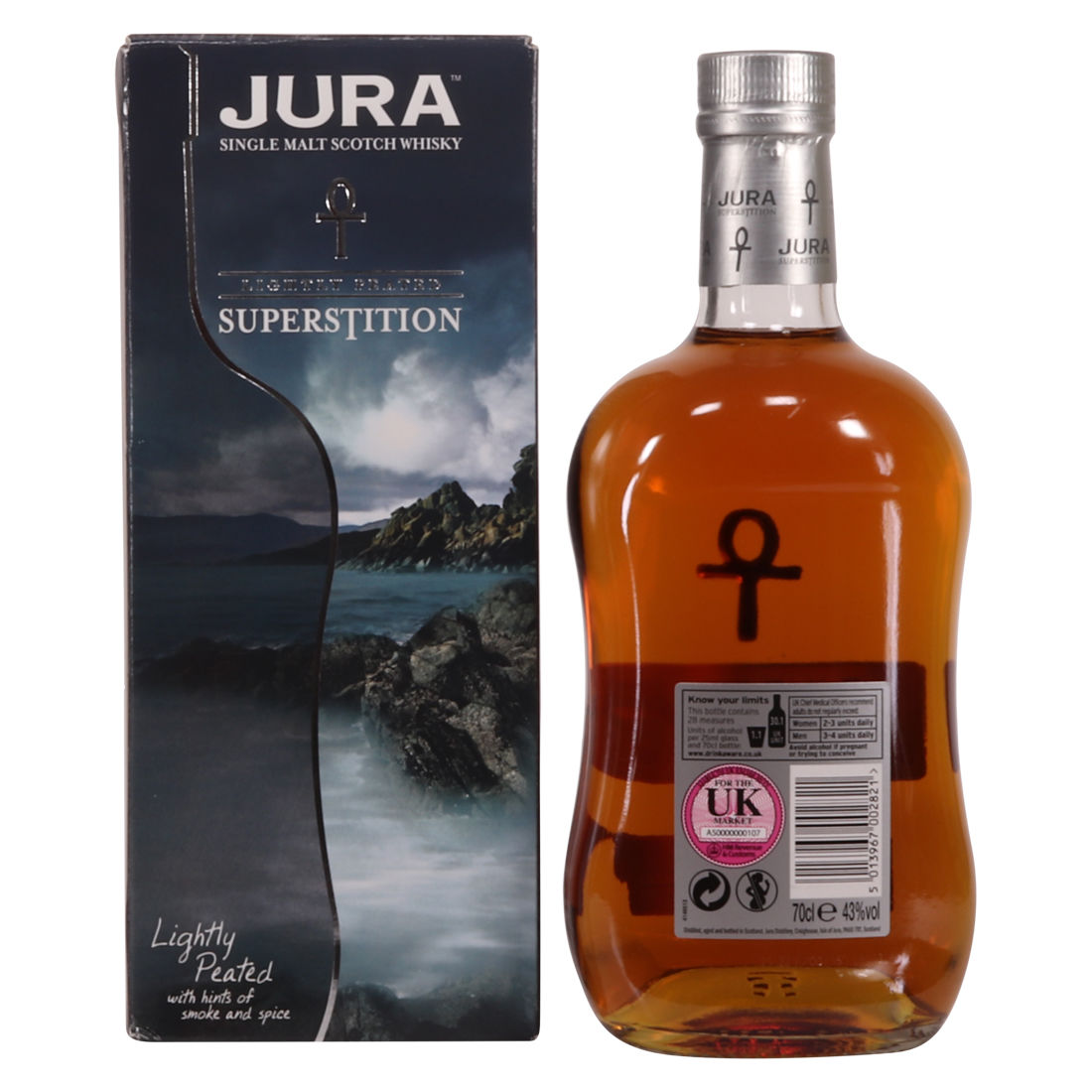 A lightly peated single malt made up of different ages. It is named after the fact that Islanders were very superstitious in the past, this is a nod to them, and to the Island of Jura which is still dotted with ancient stones and markings. When you raise a glass of this whisky, you're raising a glass to the ancient ways of the island.