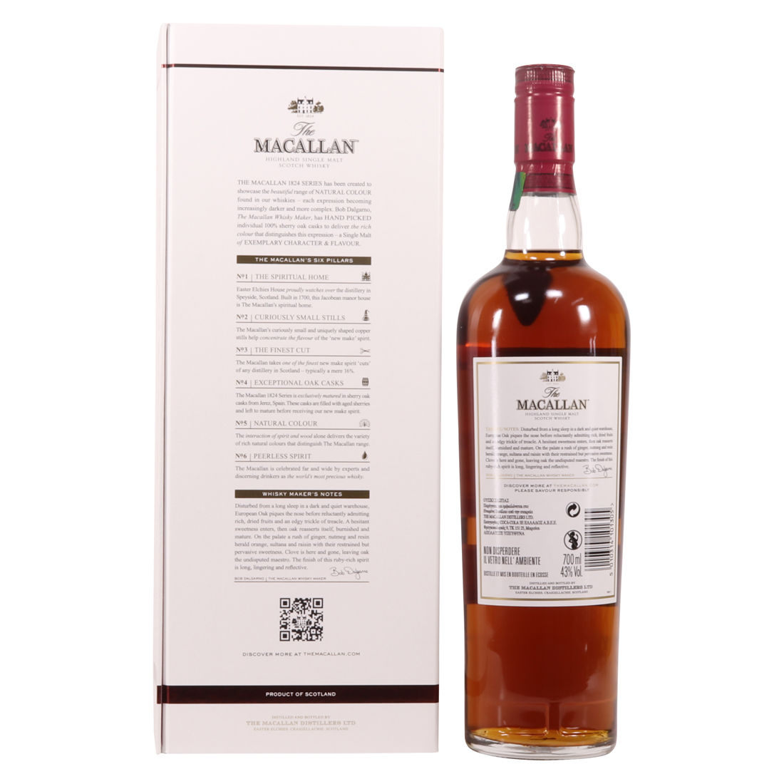 The Macallan 1824 Series celebrates natural colour. The most distinctive and defining characteristic of Macallan is the sherry-seasoned oak casks that are used to mature the whisky. This series shows commitment to 100% natural colour, drawn from wood. The colour of each expression becomes deeper as the range progresses.
