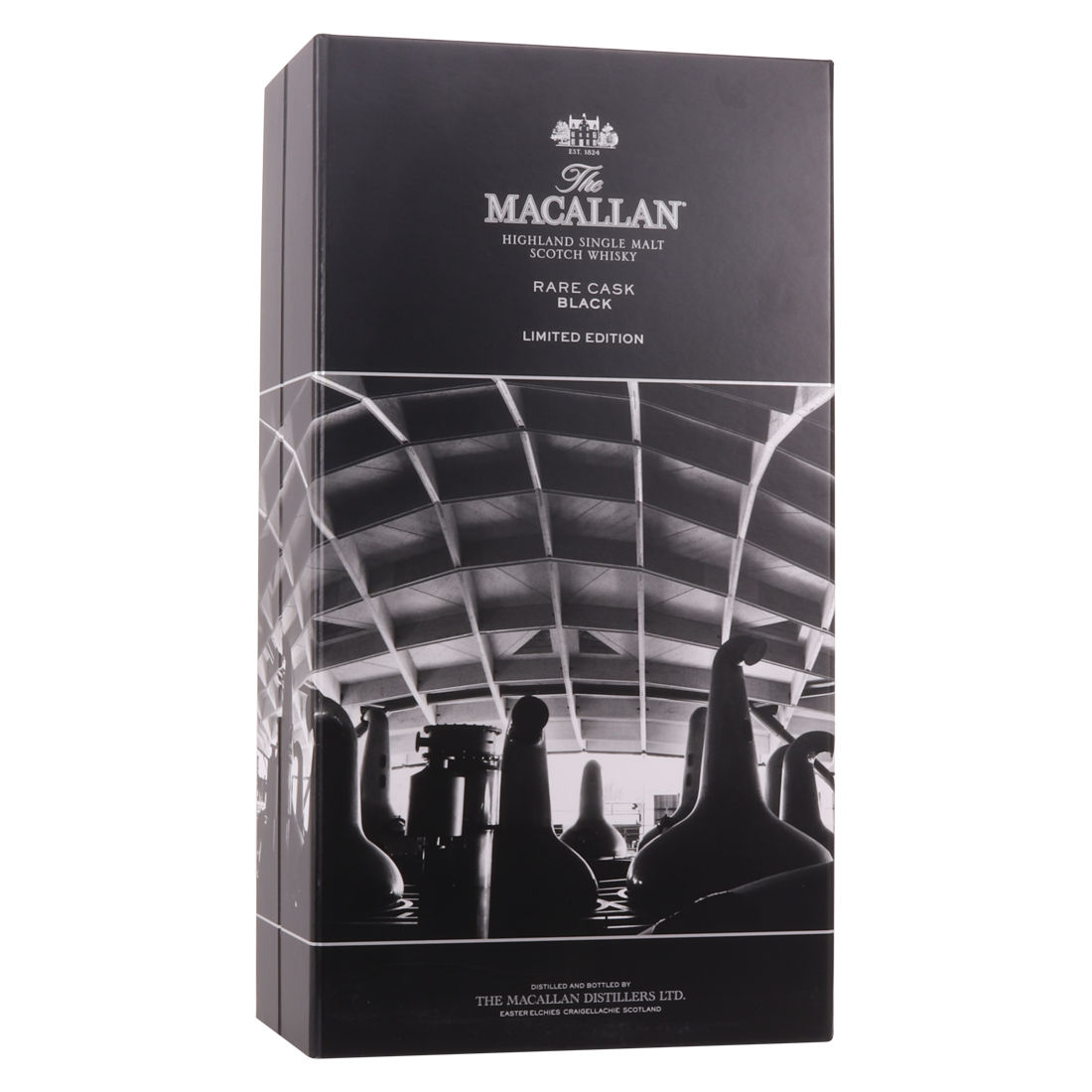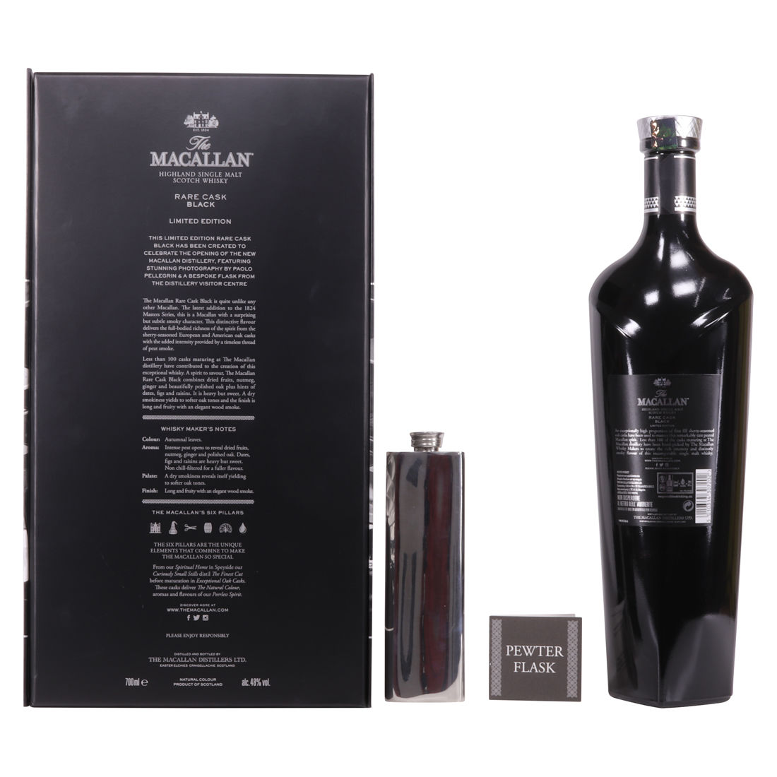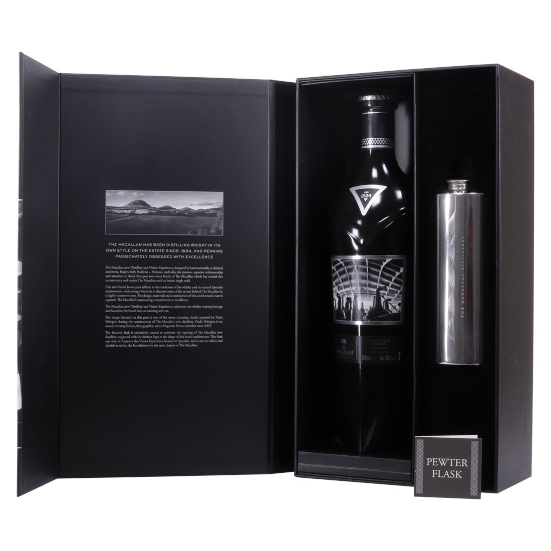 The Macallan Rare Cask Black Limited Edition was released to celebrate the opening of the new Macallan Distillery. It is part of the Macallan 1824 series and features stunning photography by Paolo Pellegrin and a bespoke flask from the Distillery Visitor Centre. The release was a limited edition of 7000 sets, which were only available at airports.