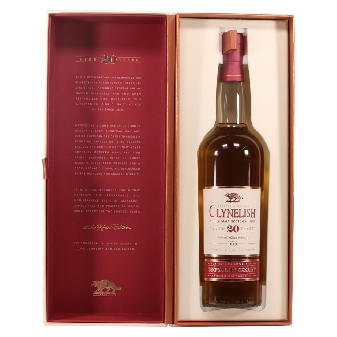 Bottled in the highlands, this 20-year-old single malt from Clynelish was bottled to commemorate the distilleries 200th anniversary. In a beautifully presented box this cask strength malt was made only available from the distillery in 2019. It was matured in a combination of Bodega Sherry European Oak and Refill American oak casks to create a stunning expression.