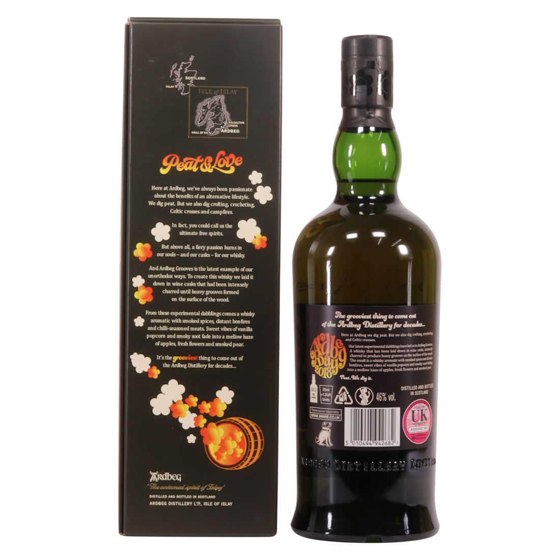 This limited edition Islay single malt was released to mark the 2018 Ardbeg Day at the Islay Festival of Music & Malt. The theme is a throwback to the Island's 1960s spirit, embodying the ideals of 'peat & love'! Ardbeg Grooves is crafted with ex-wine casks that are re-charred to create heavy grooves in the wood, allowing more interaction with the spirit and creating a richer flavour.