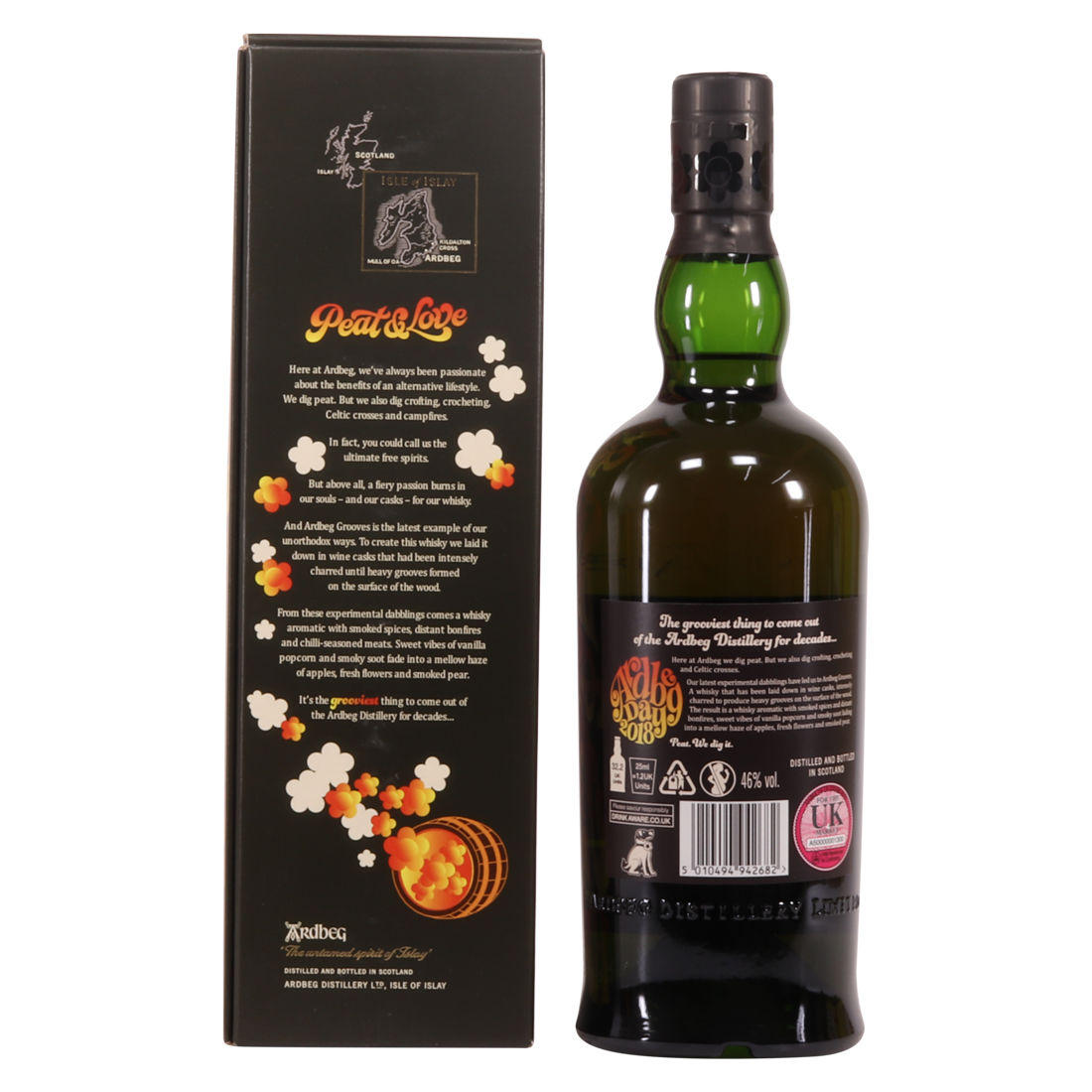 This limited edition Islay single malt was released to mark the 2018 Ardbeg Day at the Islay Festival of Music & Malt. The theme is a throwback to the Island's 1960s spirit, embodying the ideals of 'peat & love'! Ardbeg Grooves is crafted with ex-wine casks that are re-charred to create heavy grooves in the wood, allowing more interaction with the spirit and creating a richer flavour.
