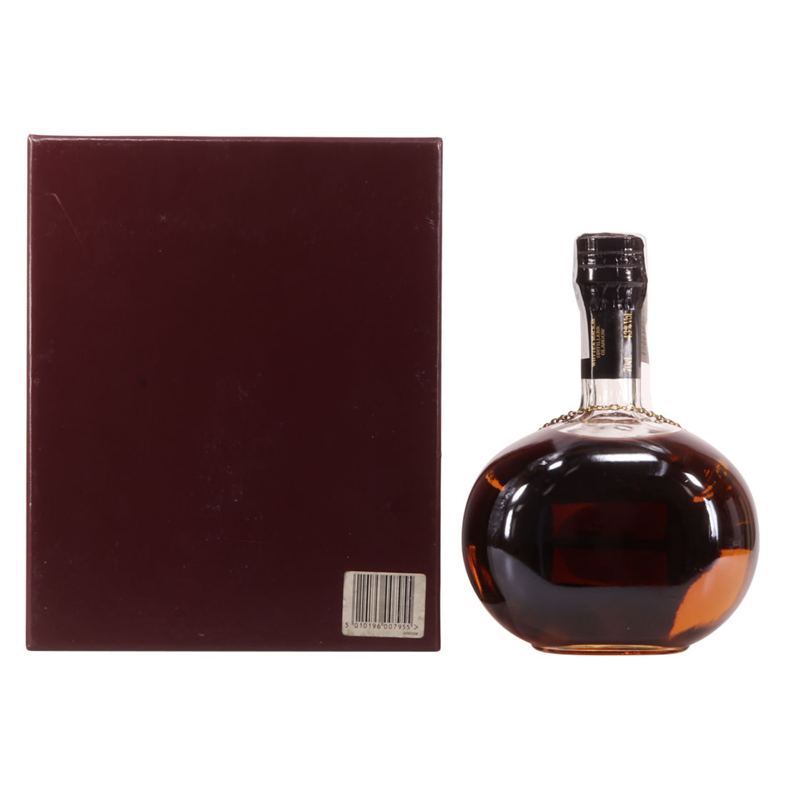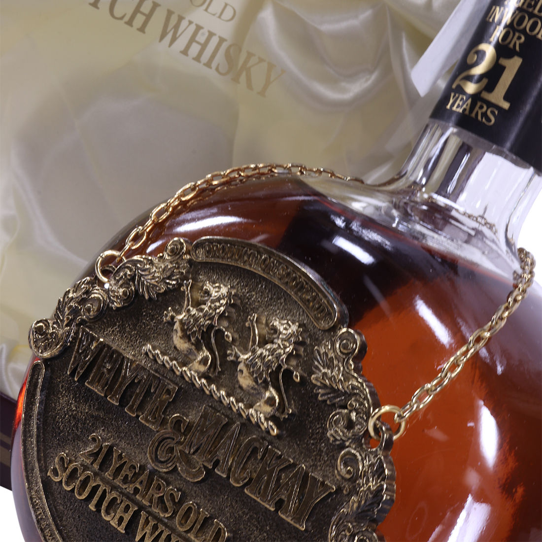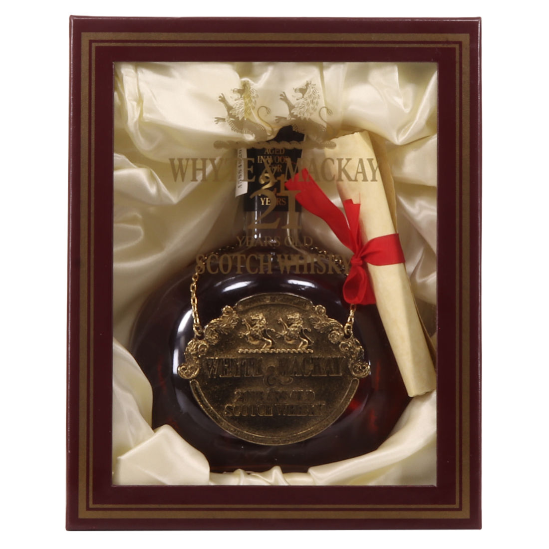 This is a very nicely presented bottle of 21-year-old blended whisky from Whyte & Mackay, which is believed to be produced in the 1980's. The bottle comes with a metallic tag that hangs from the neck of the decanter. It also comes in a beautiful silky lined wooden presentation box.
