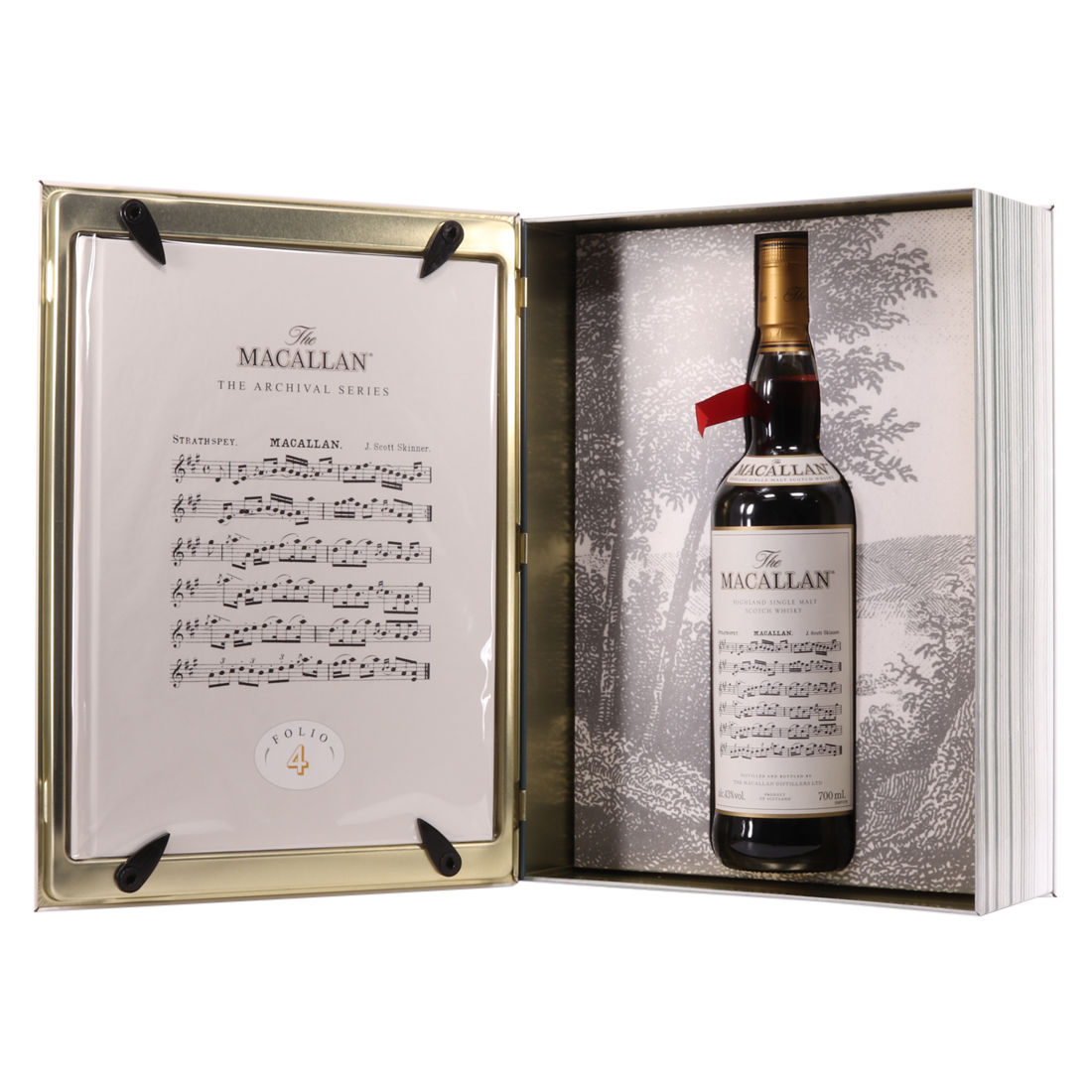 The fourth edition in the Archival Series from The Macallan. Folio 4 remembers the legendary advertising campaigns of the 1970s, 1980s and 1990s that brought The Macallan to the public’s attention outside of Scotland. It is presented in a beautiful book shaped, tin case. It features an advertisement including a Strathspey composed by James Scott Skinner (1843-1927). The advert notes that Skinner was so moved by his favourite malt he created a unique piece of music featuring his signature lilting notes with the simple catchphrase: “The Macallan. The Malt.”