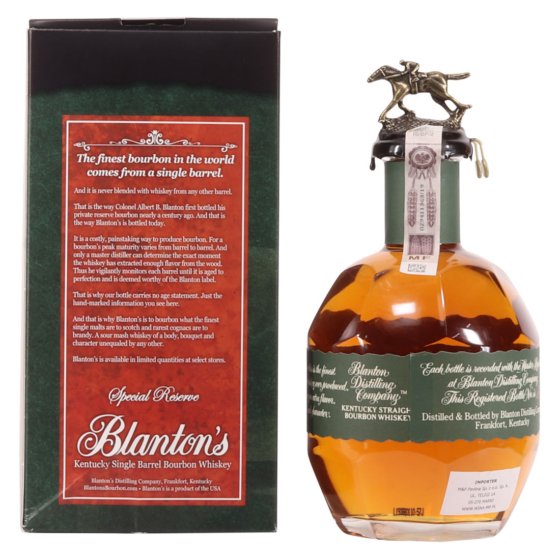 Blanton's Single Barrel Special Reserve is a lower strength single barrel bourbon. Dumped Date. Each bottle is hand-filled, hand-labelled, hand-sealed and individually numbered. 80 Proof.