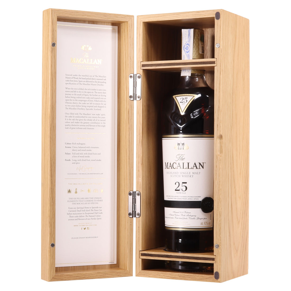 The Macallan 25 Year Old Sherry Oak 2018 release is part of Macallan's super popular Sherry Oak range. This 25 year old has been matured exclusively in hand-picked, sherry seasoned oak casks from Jerez, Spain.