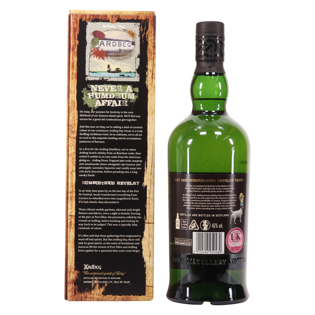 This is the 2019 Ardbeg Drum Limited edition. The Ardbeg Drum is a non-age-statement single malt matured in ex-Bourbon casks and then finished in ex-rum casks from the Americas. It was created to celebrate Ardbeg Day 2019 (June 1) held during the Islay Festival of Music & Malt (Fèis Ìle).
