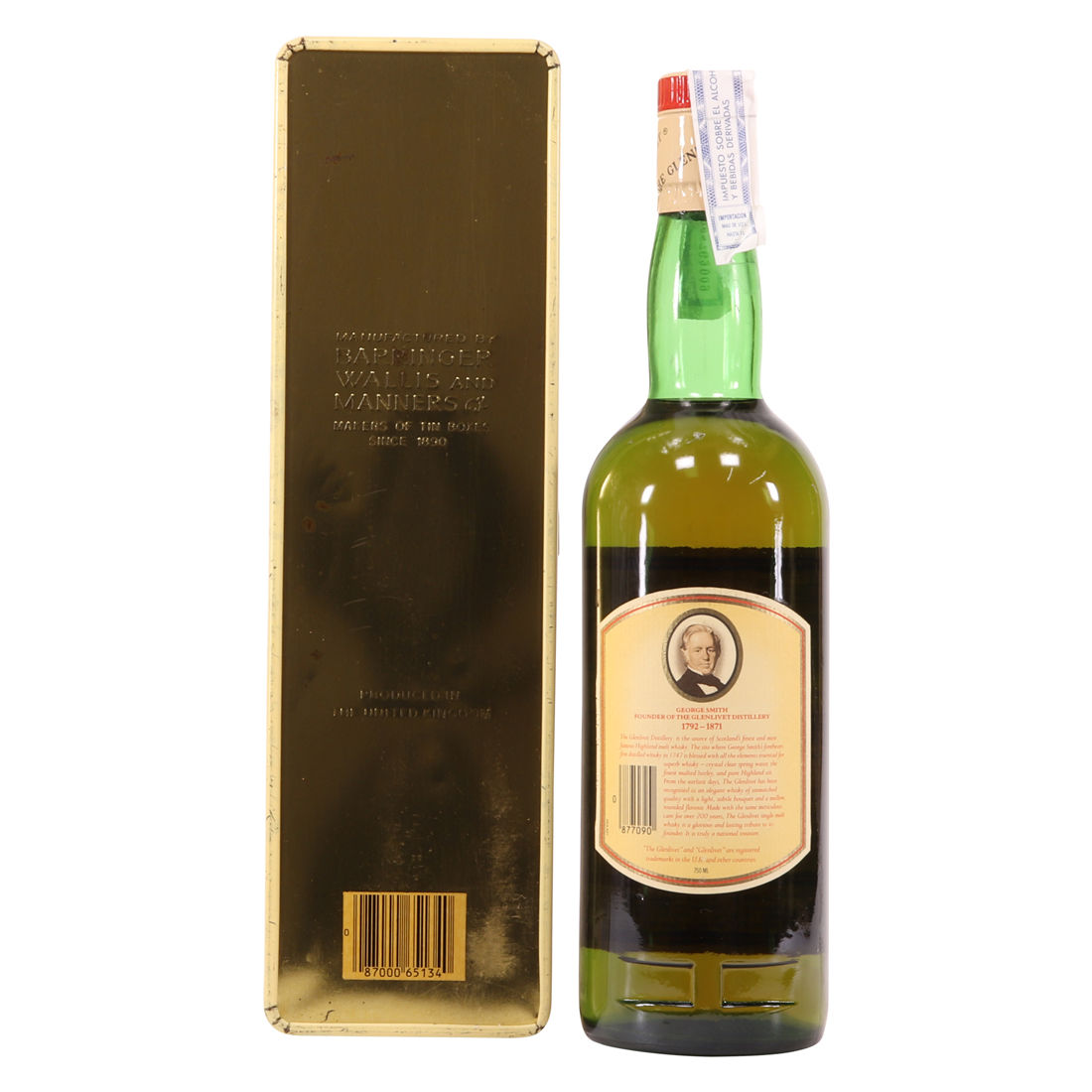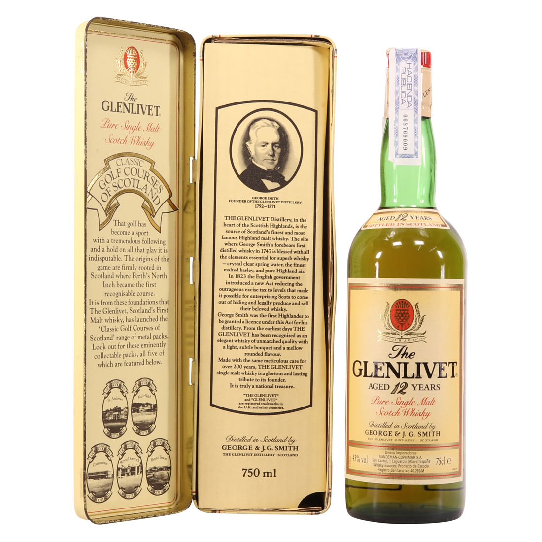 This bottling Glenlivet 12 year old single malt is said to be from the 1980's. It comes with a beautiful presentation tin depicting Royal Dornoch, one of Scotlands greatest golf courses. It was released as part of a 6 part series that each celebrates a Scottish golf course - including Turnberry, St. Andrews, Troon, Muirfield and Carnoustie. This is a 75cl bottling.