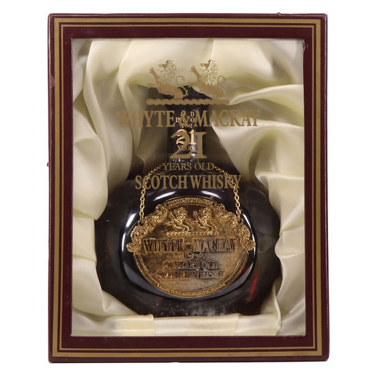 This is a very nicely presented bottle of 21-year-old blended whisky from Whyte & Mackay, which is believed to be produced in the 1980's. The bottle comes with a metallic tag that hangs from the neck of the decanter. It also comes in a beautiful silky lined, wooden presentation box.
