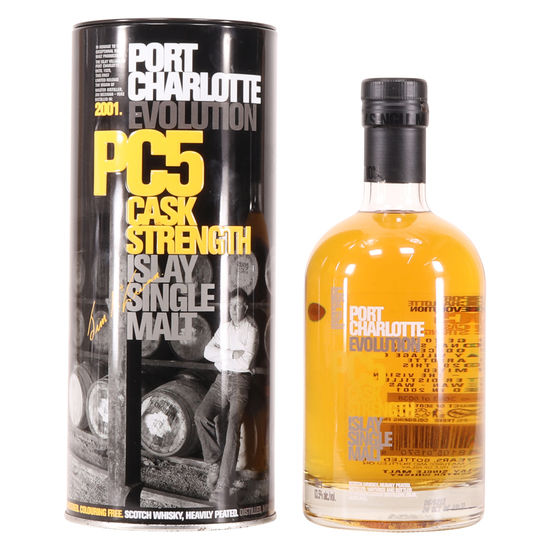 Port Charlotte PC5, produced by Bruichladdich Distillery, is a heavily peated spirit. It was the first release of heavily peated Port Charlotte and was produced in 2001 from some of the first spirits to be produced after the distillery's reopening. The single malt was bottled at 5 years old in 2006 and was limited to 6038 bottles.