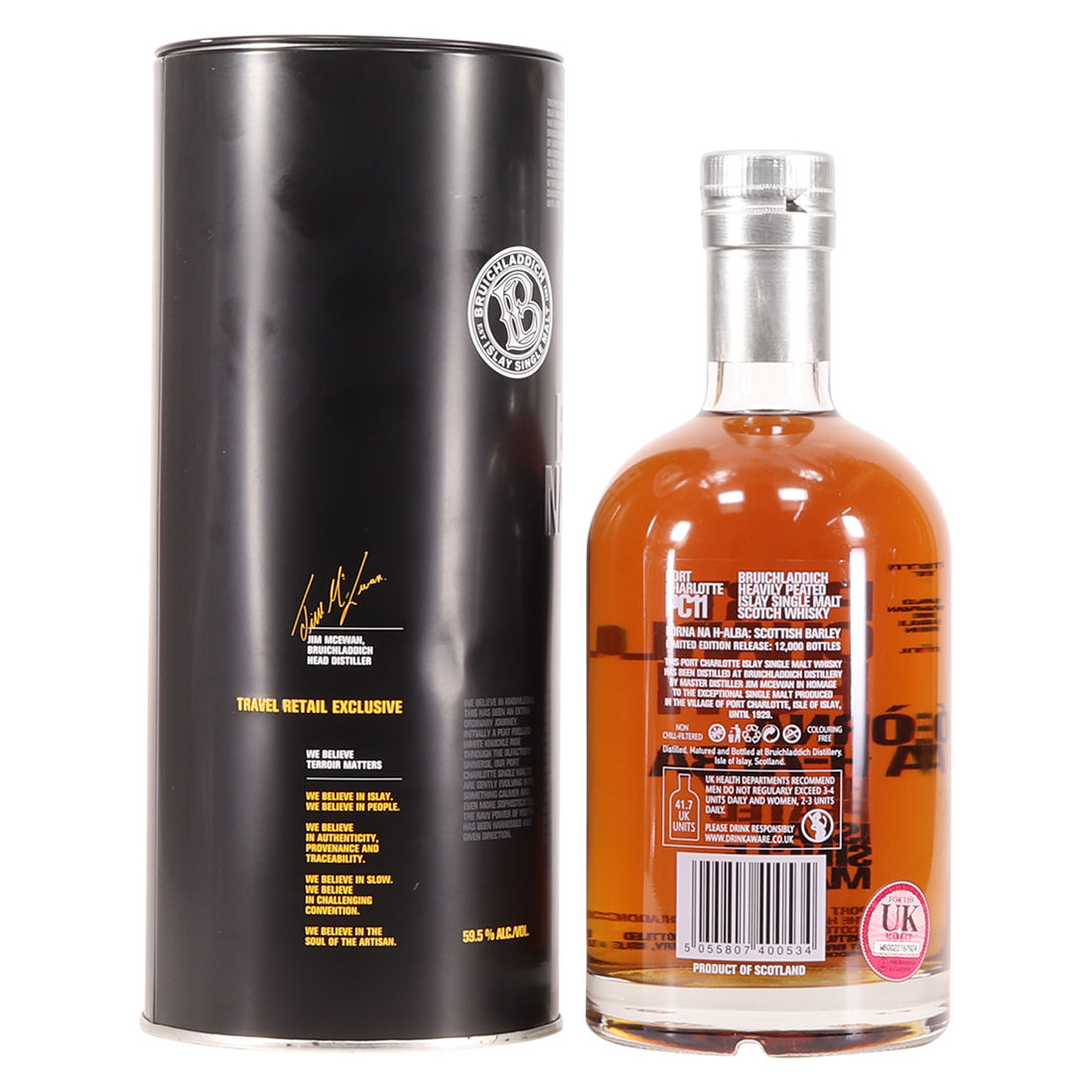 Port Charlotte and PC 11 (produced by Bruichladdich) is a heavily peated spirit (travel exclusive)