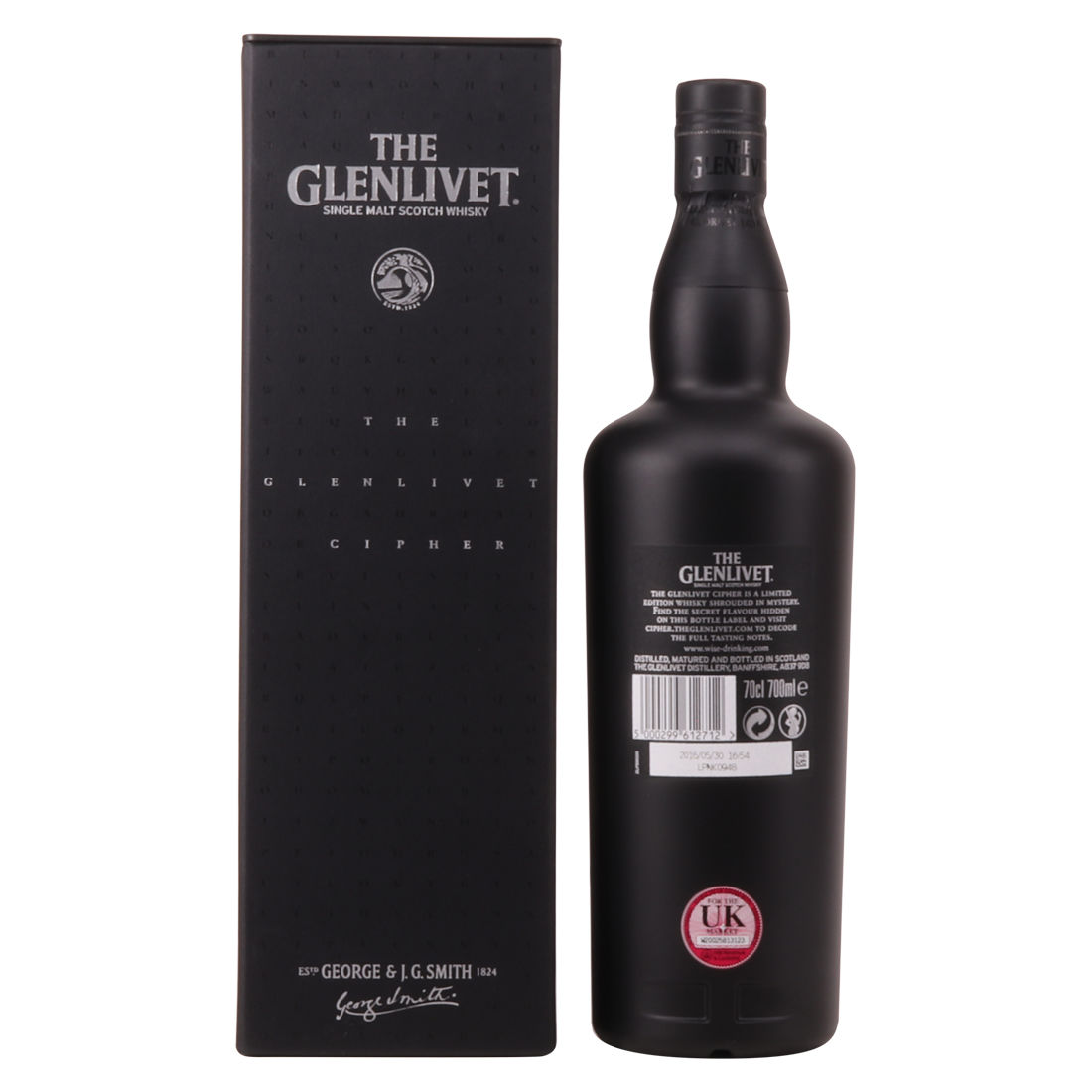 A limited-edition single malt whisky from The Glenlivet's Master Distiller, Alan Winchester. The Glenlivet Cipher comes in an opaque black bottle without cask information, tasting notes and age statement. This bottle is surrounded by mystery. You are encouraged to find the secret flavour hidden on the bottle label and visit the Cipher website for full tasting notes.