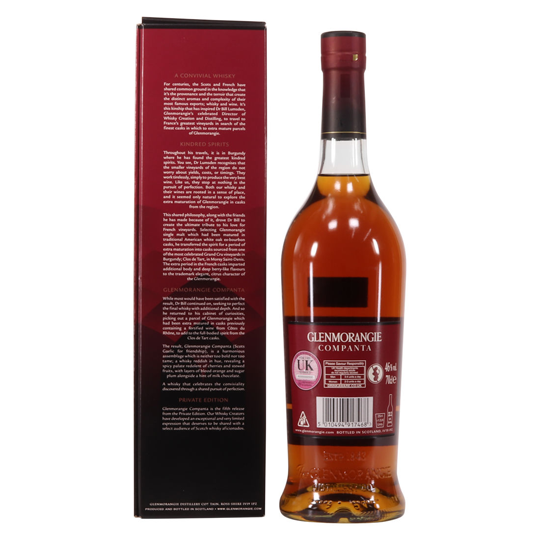 After first maturing in American white oak ex-bourbon barrels, the Companta was matured in 60% Burgundy wine casks from Clos de Tart and 40% Rhône Valley casks that previously held Rasteau, sourced by Glenmorangie's Director of Distilling, Dr. Bill Lumsden.