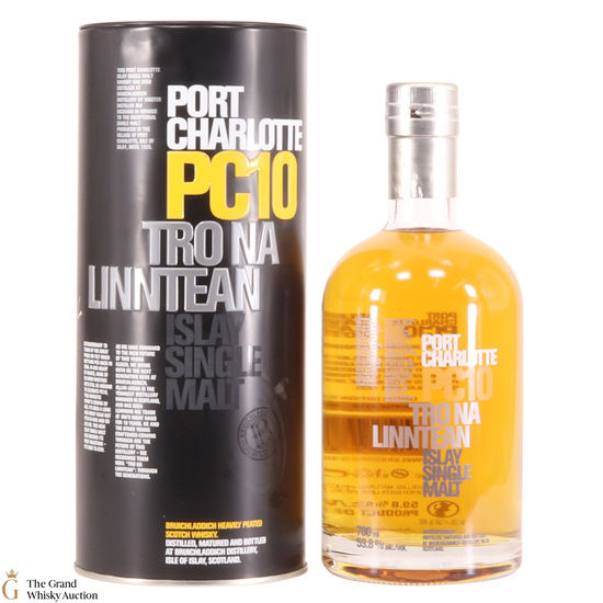 Port Charlotte PC10, produced by Bruichladdich Distillery, is a heavily peated spirit. It was the first release of heavily peated Port Charlotte and was produced in 2001 from some of the first spirits to be produced after the distillery's reopening. The single malt was bottled at 10 years old and was limited to 6000 bottles.
