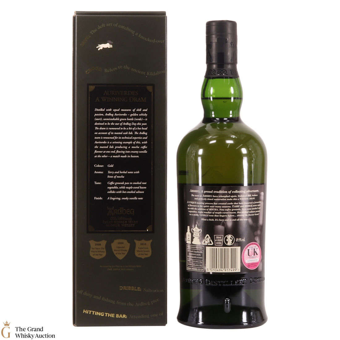 This special edition Ardbeg single malt was released on Ardbeg Day 2014. during Feis Ile. Auri(Gold) verdes (Green) it refers to the golden whisky and the iconic Ardbeg green bottle of Ardbeg whisky. It is said to be a dram of two halves - the whisky uses toasted cask lids to create Mocha Coffee flavours that team up with creamy vanilla.