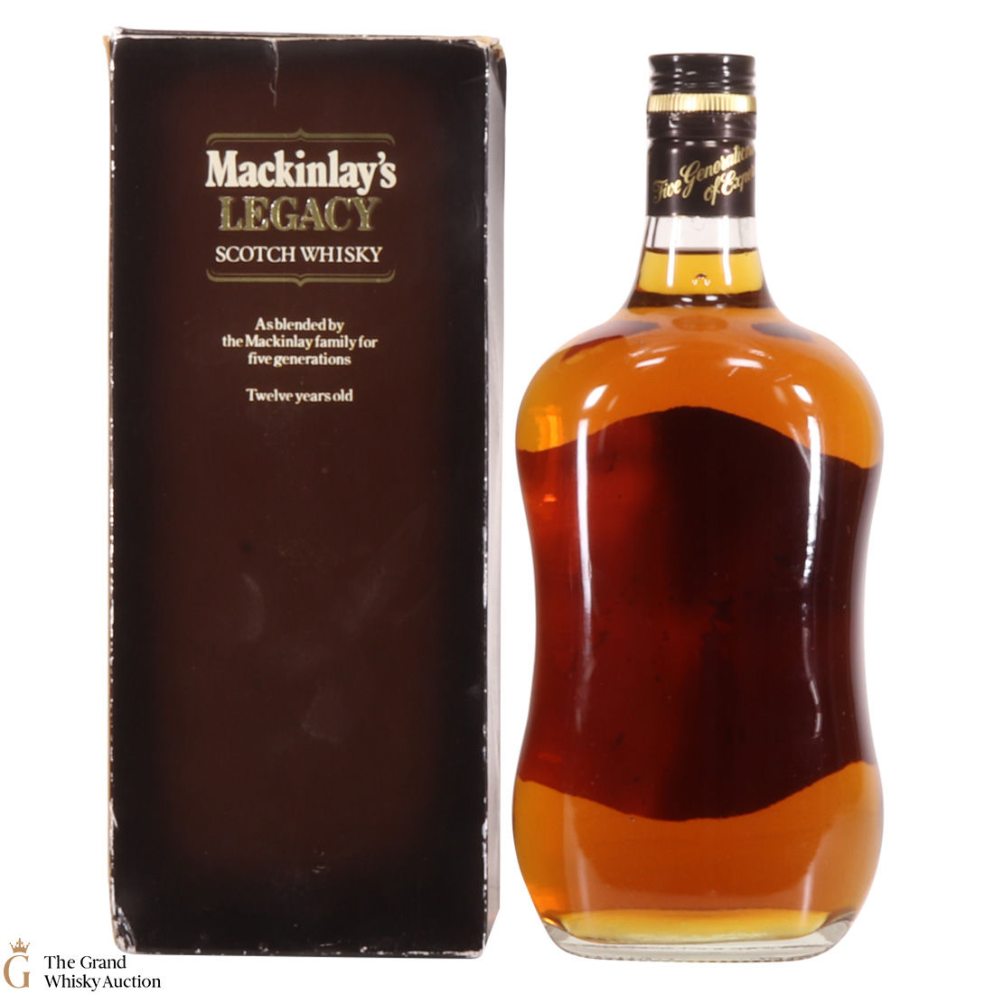 This is an older style bottling of Mackinlay's 12 year old Legacy blended whisky. The brand is the same one that Shackleton shipped to Antartica for the Nimrod expedition in 1907. It is estimated that this bottle dates from the 1980s. This is a 75cl bottling.