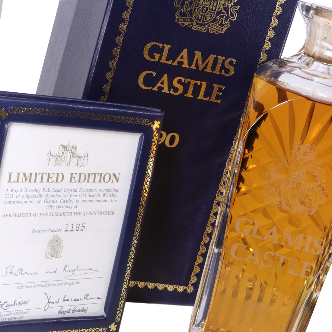 A Royal Brierley full lead crystal decanter specially blended 25 year old whisky which was released in 1990. It was commissioned by Glamis Castle to Commemorate the 90th Birthday of Her Majesty Queen Elizabeth the Queen Mother. It is presented in an elegant crystal decanter and comes with a silk lined presentation box.