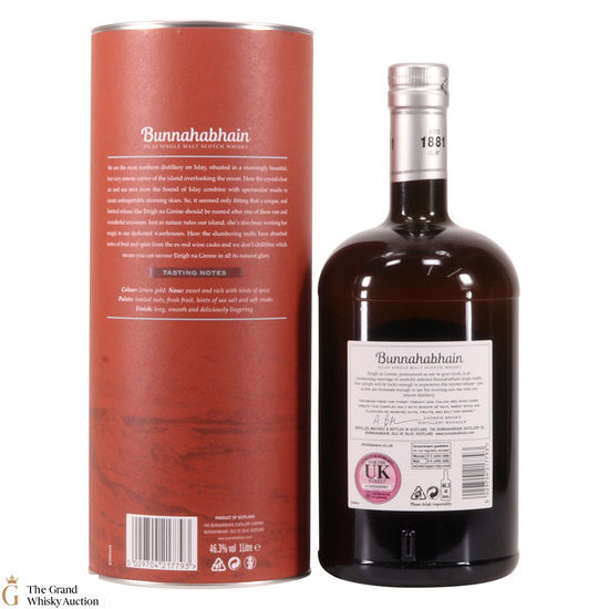 Bunnahabhain's Eirigh Na Greine was originally released for the Travel Retail market. This bottling was named 'Eirigh Na Greine' meaning 'Morning Sky' in Gaelic. It is made up from various ages of Bunnahabhain single malt, primarily matured in high-quality red wine casks which has resulted in juicy berry notes throughout, blending well with the wafts of sea salt and orchard fruit. This is a 1-litre bottling.