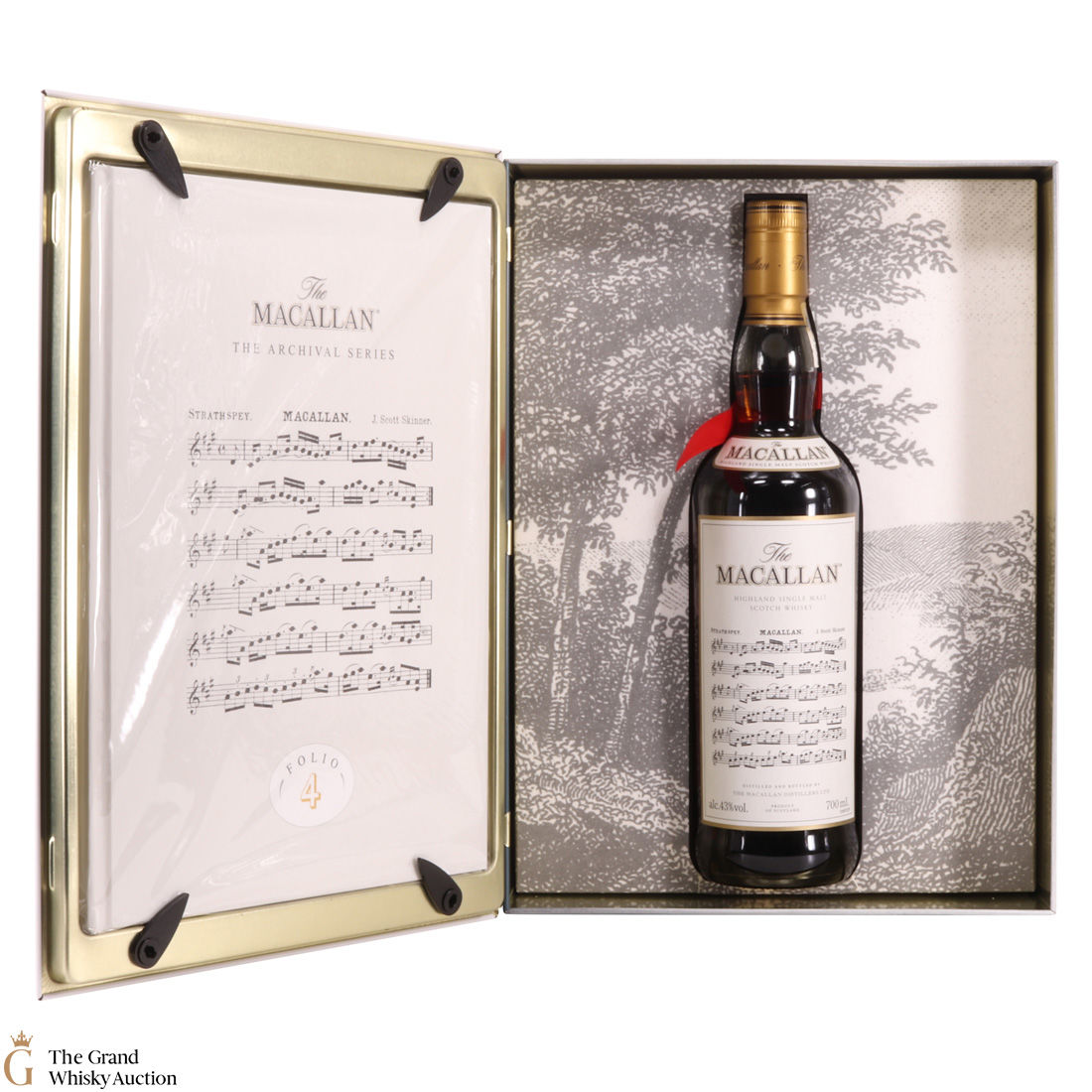 The fourth edition in the Archival Series from The Macallan. Folio 4 remembers the legendary advertising campaigns of the 1970s, 1980s and 1990s that brought The Macallan to the public’s attention outside of Scotland. It is presented in a beautiful book shaped, tin case. It features an advertisement including a Strathspey composed by James Scott Skinner (1843-1927). The advert notes that Skinner was so moved by his favourite malt he created a unique piece of music featuring his signature lilting notes with the simple catchphrase: “The Macallan. The Malt.”