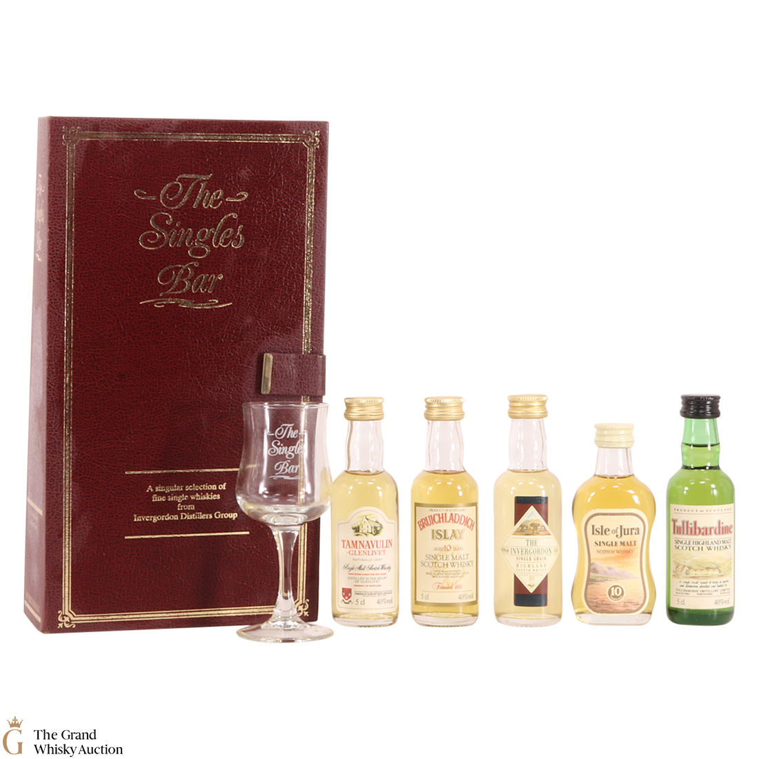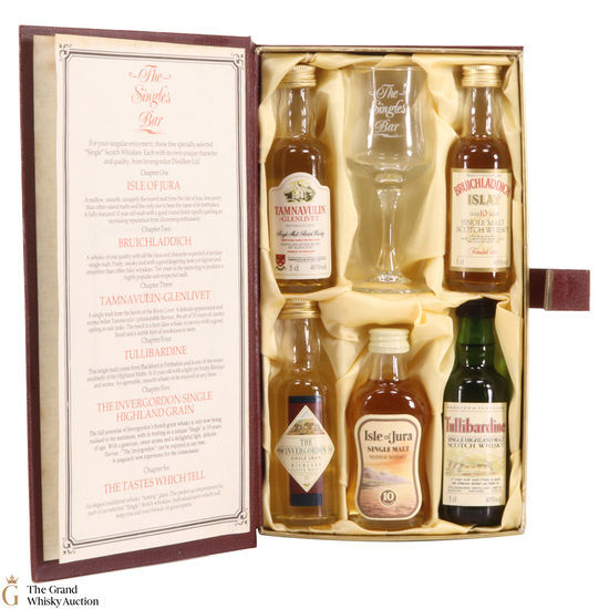 This book-themed presentation box contains a collection of Scotch whiskies from Invergordon Distillers. The Singles Bar set includes a tasting glass & 5 x 5cl whiskies.
