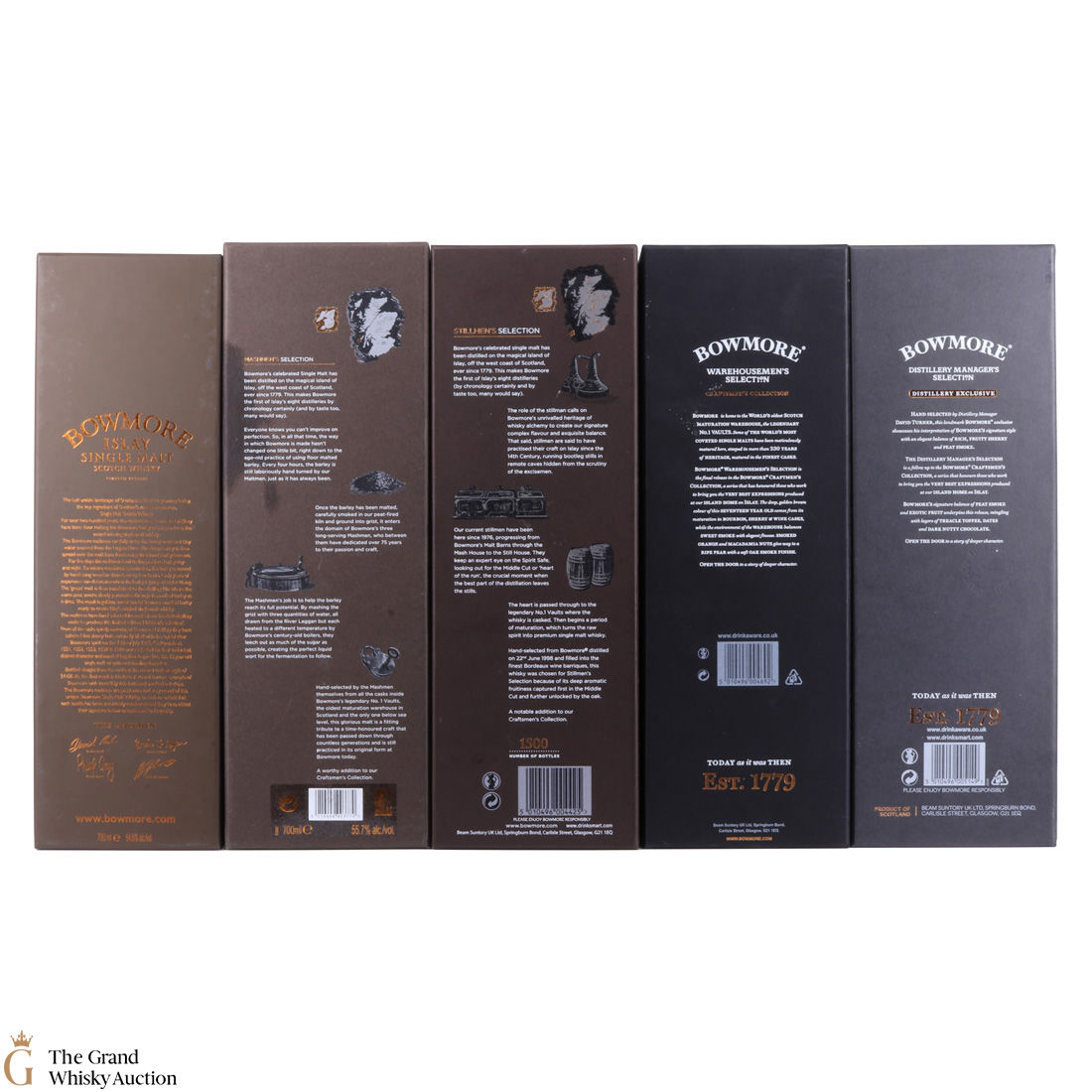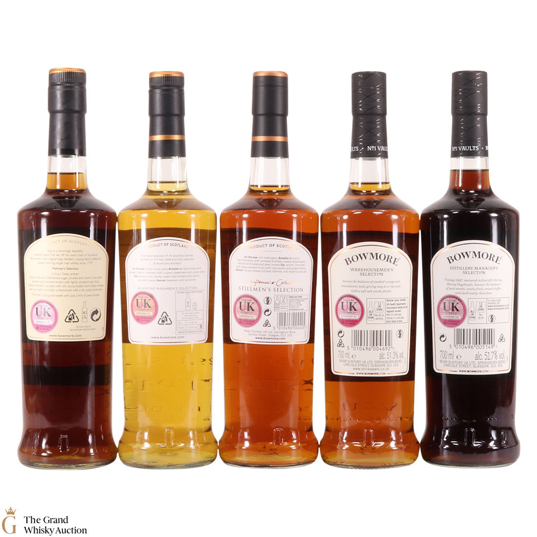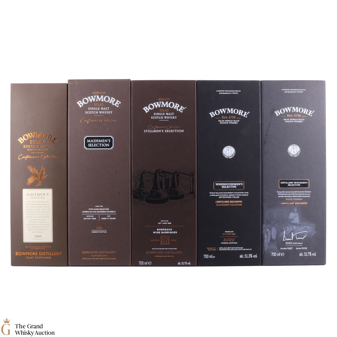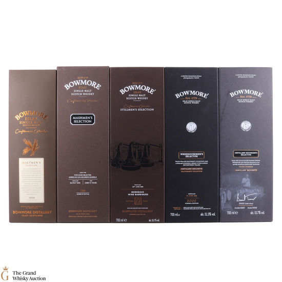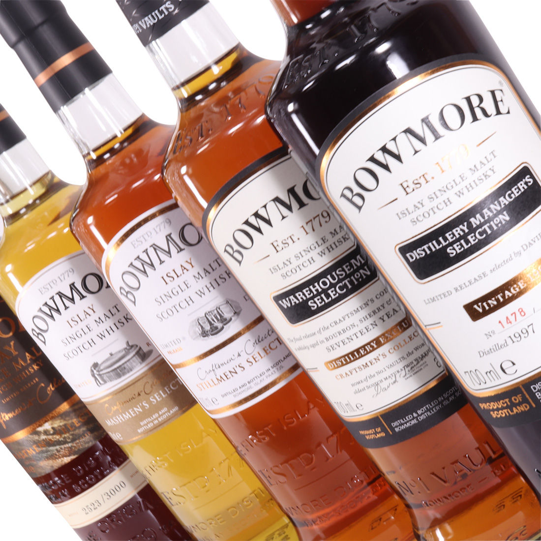 - Bowmore Warehousemen's Selection - Last in the series, distilled in 1999 and bottled 17 years later, 3000 bottles were produced from a mixture of Bourbon, Sherry and Wine Casks.