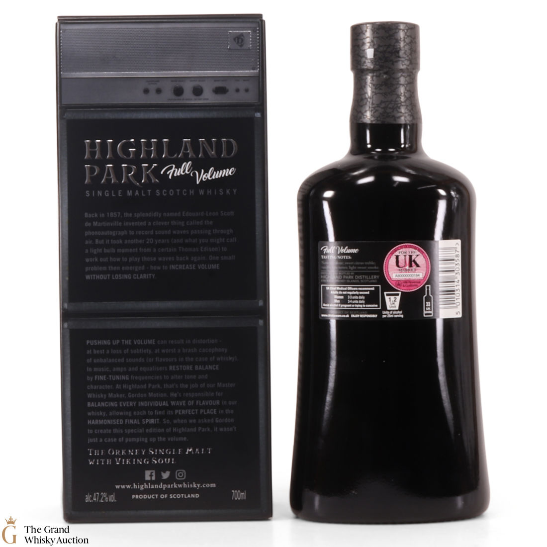 Full Volume by Highland Park was distilled in 1999 and bottled in 2017 from 481 casks. The single malt was matured exclusively in first-fill bourbon casks and was bottled at 47.2% ABV and comes presented in a themed presentation box resembling speaker.