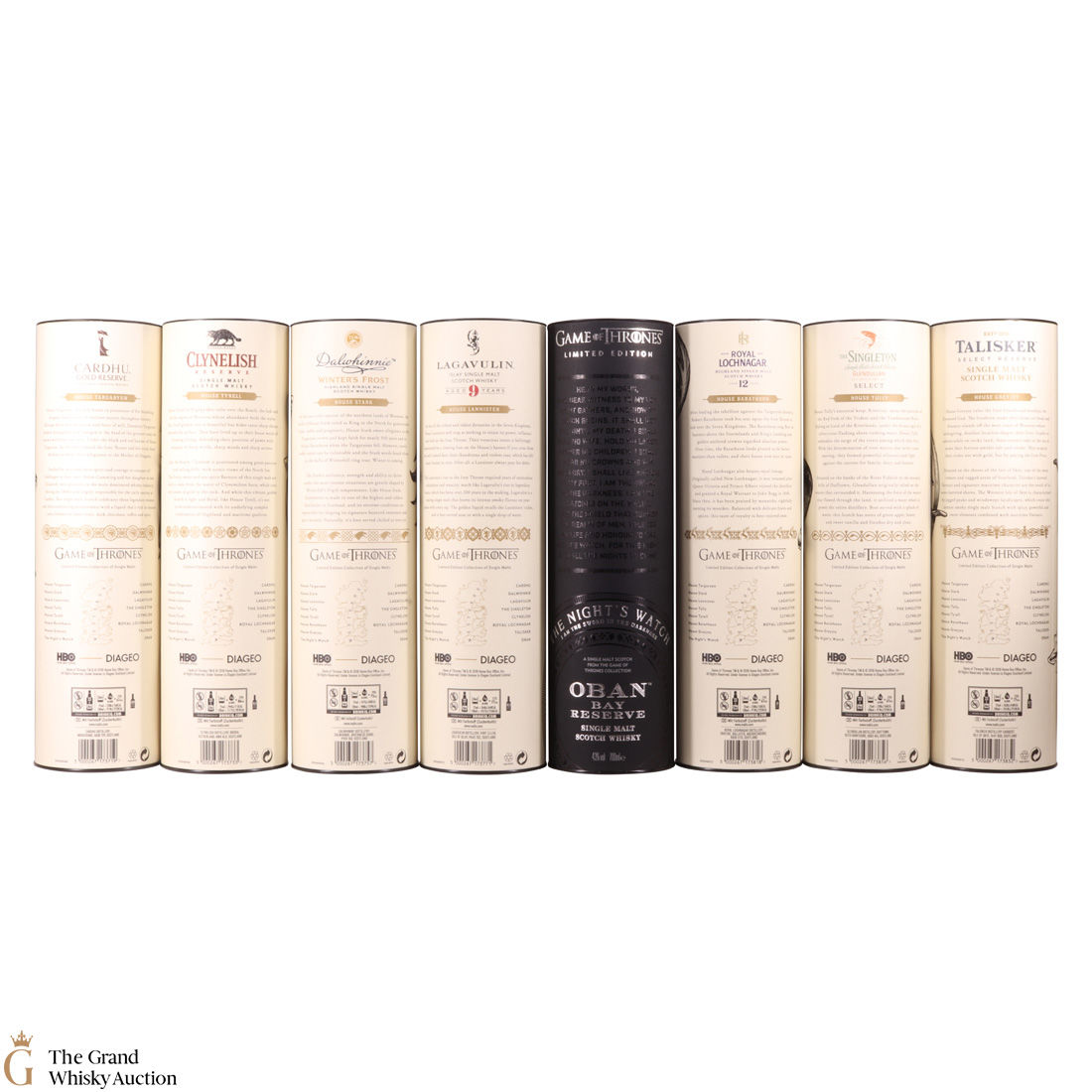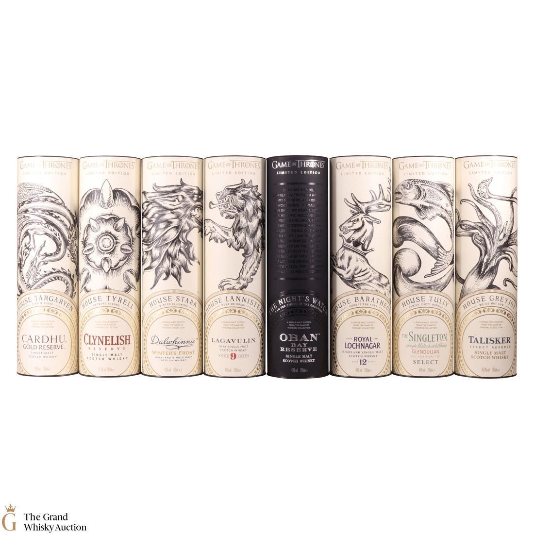 Each of the Game of Thrones Scotch whiskies has been paired with a particular house from the seven kingdoms in the television series, plus the Night’s Watch guard.