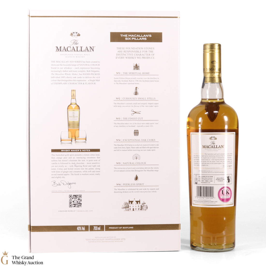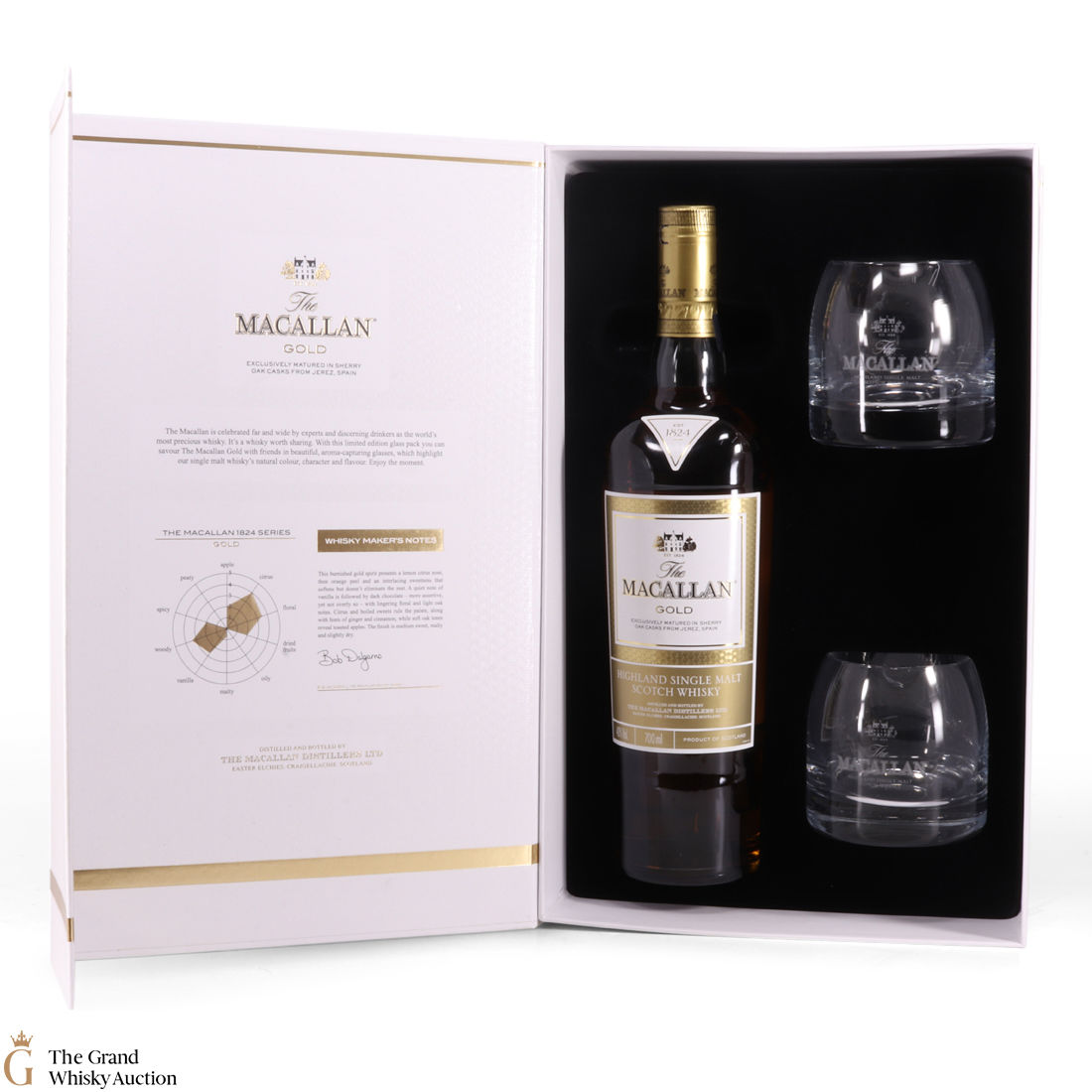 A stylish Macallan gift pack. It contains a 70cl bottle of the Gold expression from the Macallan 1824 Series, and two limited-edition branded Macallan whisky tumblers.