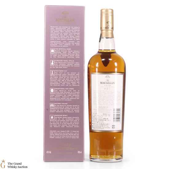 The Macallan Fine Oak 17 Years Old is part of the Macallan Fine Oak range. It has been matured for a minimum of seventeen years in three oak cask types including American and European ex-oloroso sherry and American oak bourbon casks. It was introduced to the US market in 2006.