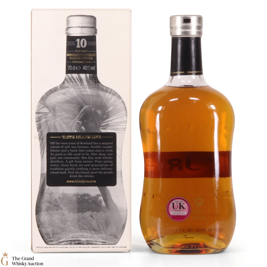 A bottle of Jura 10 Year Old. Originally built in 1810, the distillery fell into disrepair and wasn't revived until the 1960's by two local estate owners.