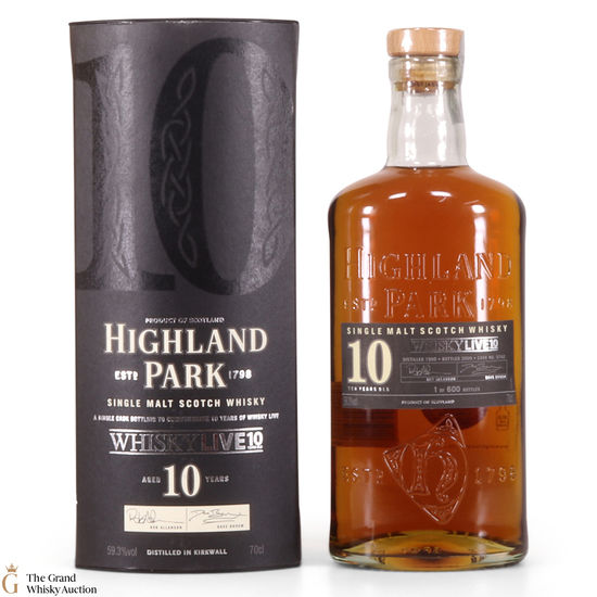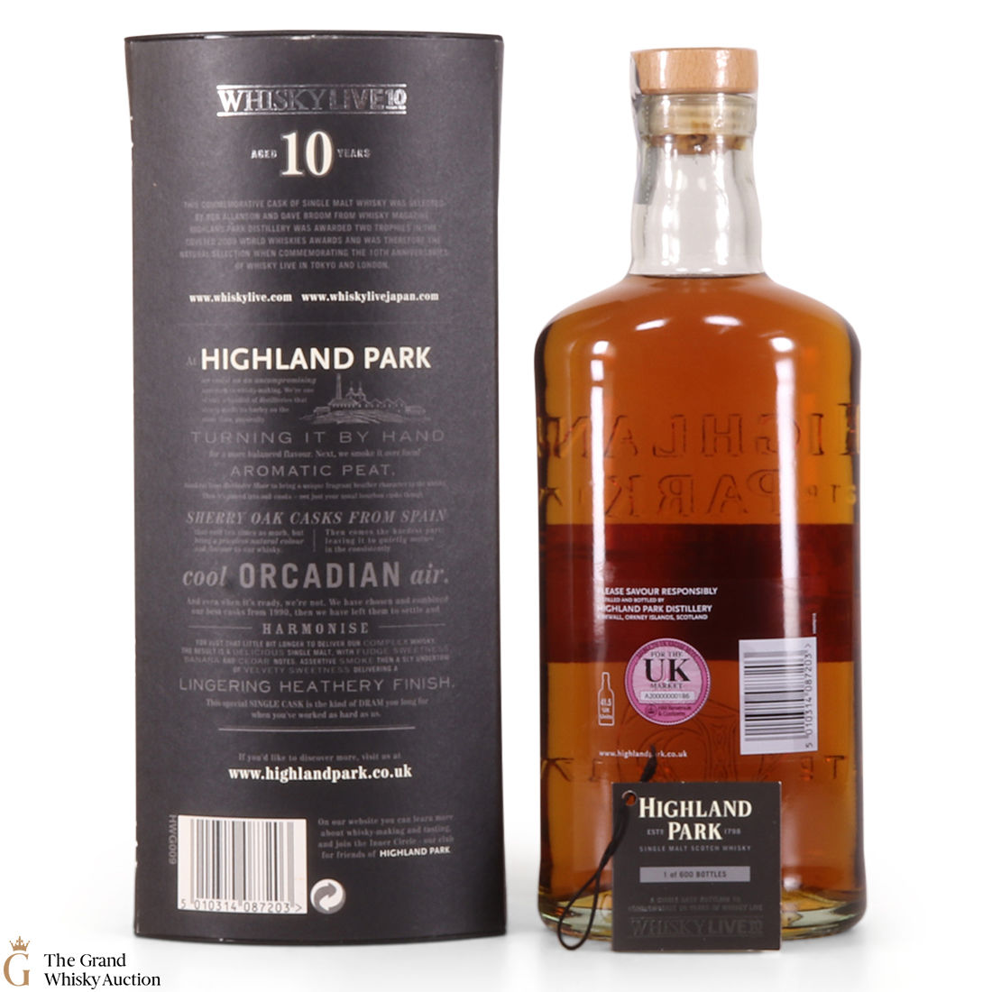 This is a limited edition 10-year-old Highland Park bottled to commemorate 10 years of Whisky Live. It was distilled in 1999, matured in sherry Oak casks, bottled in 2009 at the cask strength of 59.3%. This is a limited edition of only 600 bottles.