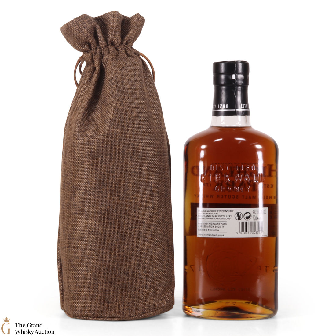 This bottling is part of Highland Park's Single Cask Series and was bottled exclusively for Highland Park Appreciation Society. Distilled in 2003, this single malt was matured for 13 years in refill butt #2115 at the cask strength of 59.1% ABV. With only 576 bottles available, this is an extremely limited edition.