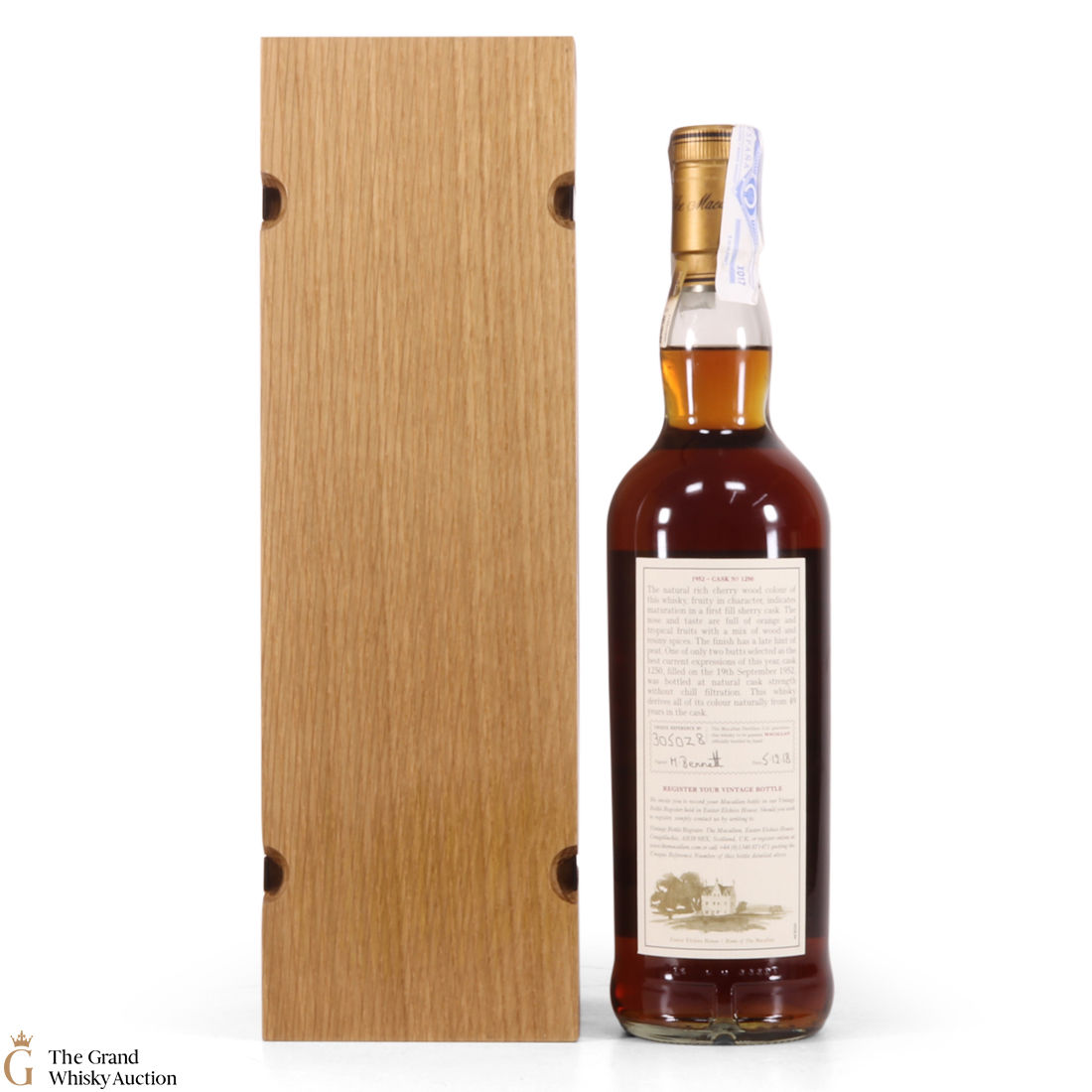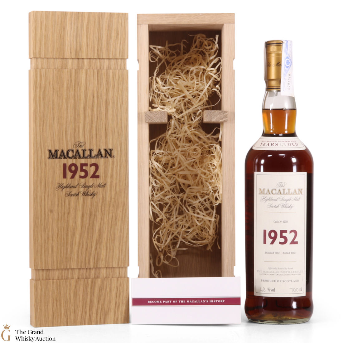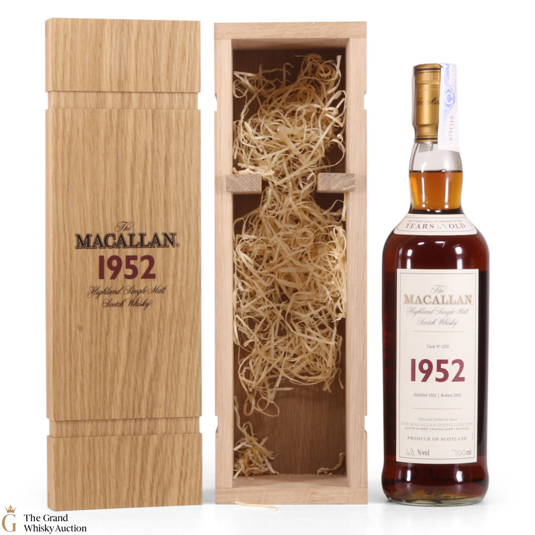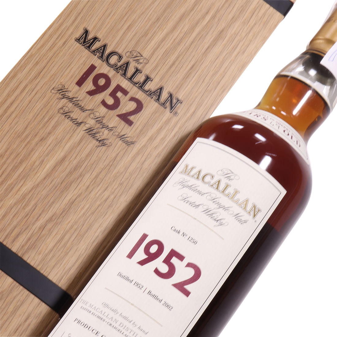 This is a beautiful bottle of 1952 vintage Macallan. It was distilled in 1952 and aged in a Sherry cask for an impressive 49 years, in cask 1250, before being bottled in 2002 at 48% ABV. This bottle is an impressive vintage release from The Macallan Fine & Rare series. It comes with a smart wooden presentation case.