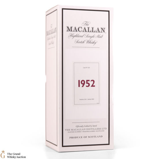 This is a beautiful bottle of 1952 vintage Macallan. It was distilled in 1952 and aged in a Sherry cask for an impressive 49 years, in cask 1250, before being bottled in 2002 at 48% ABV. This bottle is an impressive vintage release from The Macallan Fine & Rare series. It comes with a smart wooden presentation case.