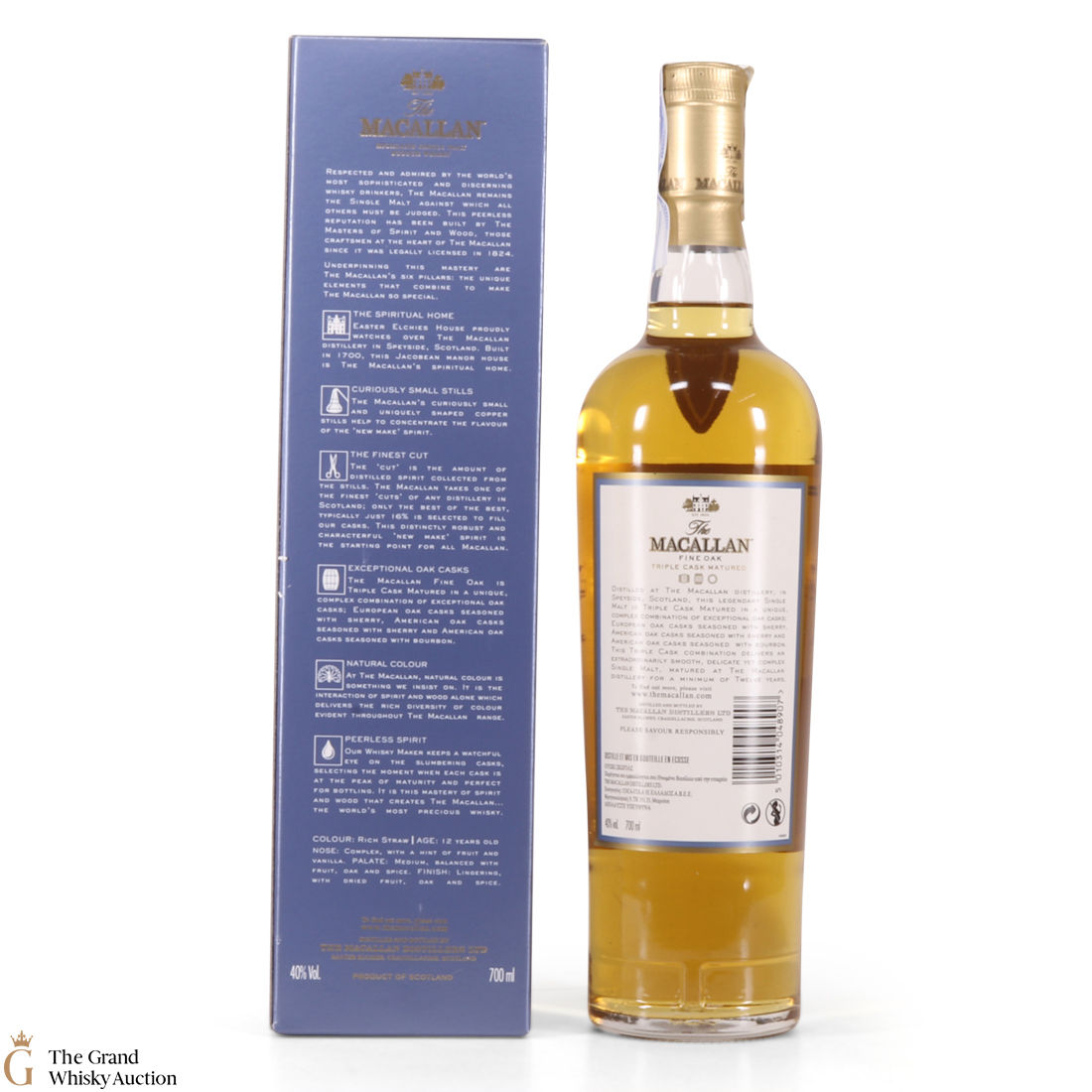 This 12 year old single malt is part of Macallan's Fine Oak, triple cask matured range. It has been matured for twelve years in three oak cask types; Europen oak seasoned with sherry, American oak seasoned with sherry and American oak seasoned with bourbon. The Macallan Fine Oak 12 Year Old is medium-bodied and balanced with fruit, oak and spice.