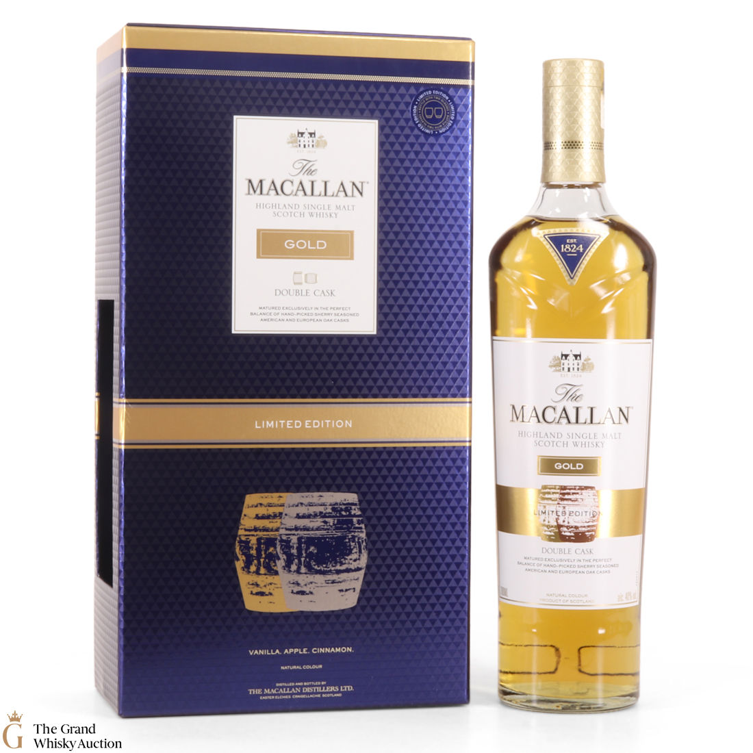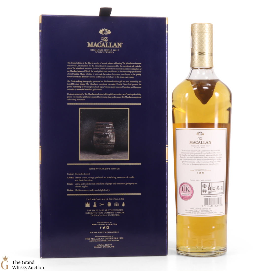 A stylish Macallan gift pack. It contains a 70cl bottle of the Gold Double Cask expression from the Macallan.