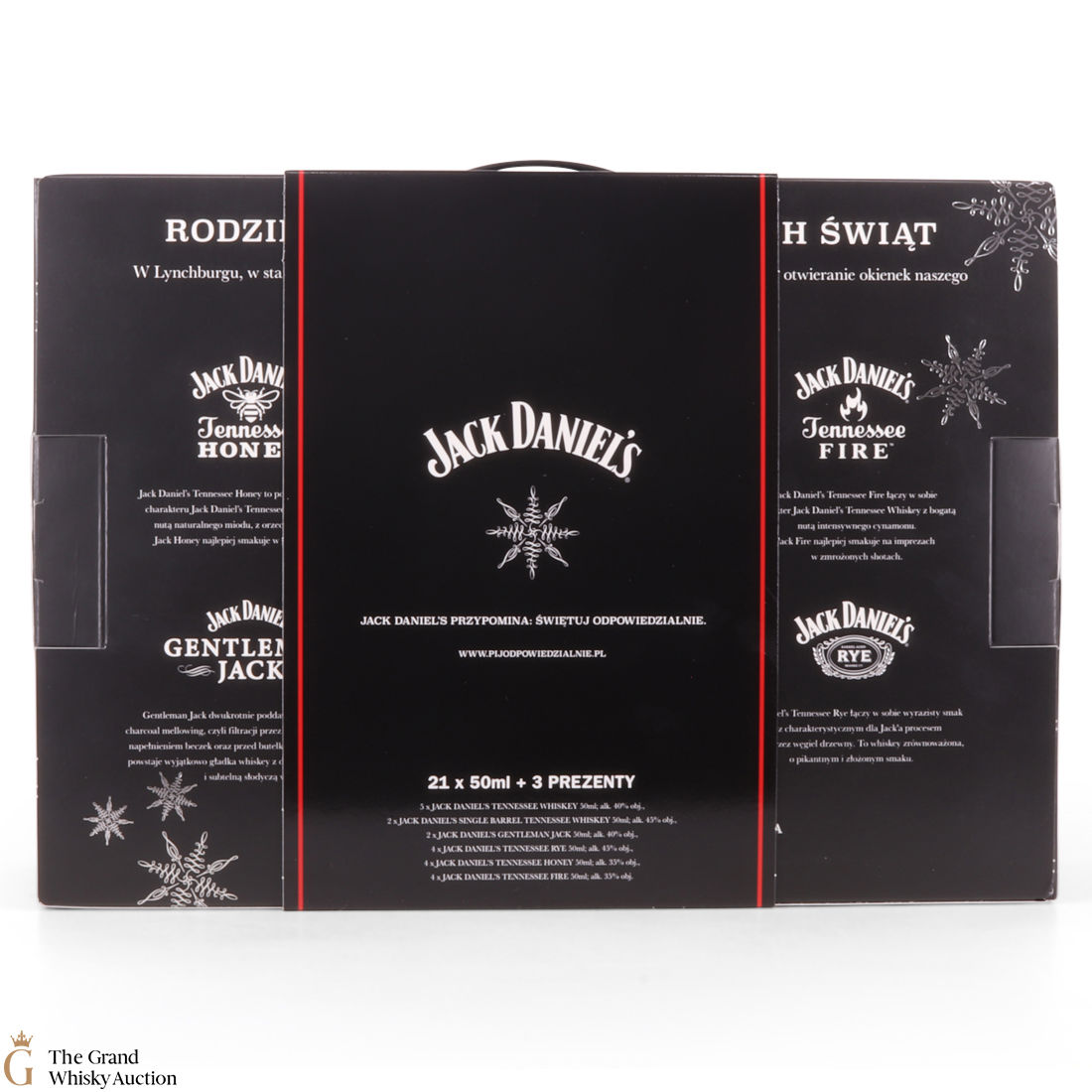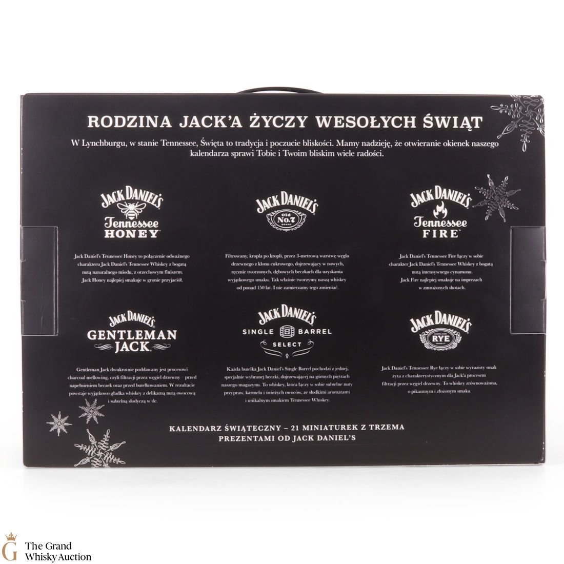 The calendar contains four miniature bottles of each Jack Daniel’s flavour: Jack Daniel’s Tennessee Whiskey, Jack Daniel’s Tennessee Rye, Jack Daniel’s Tennessee Honey and Jack Daniel’s Tennessee Fire. Additionally, there are two miniature bottles of Gentleman Jack and two Jack Daniel’s Single Barrel Select.