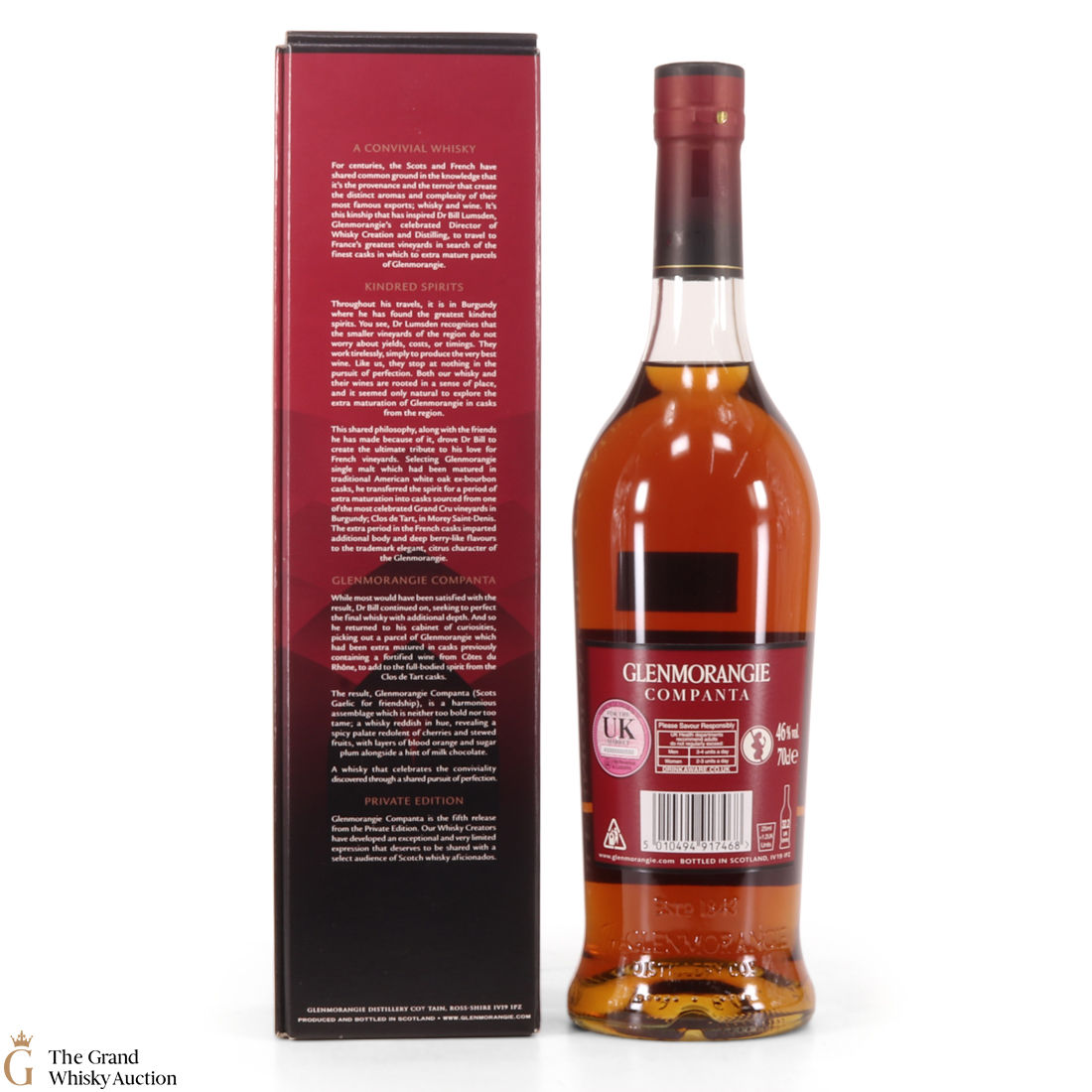 After first maturing in American white oak ex-bourbon barrels, the Companta was matured in 60% Burgundy wine casks from Clos de Tart and 40% Rhône Valley casks that previously held Rasteau, sourced by Glenmorangie's Director of Distilling, Dr. Bill Lumsden.