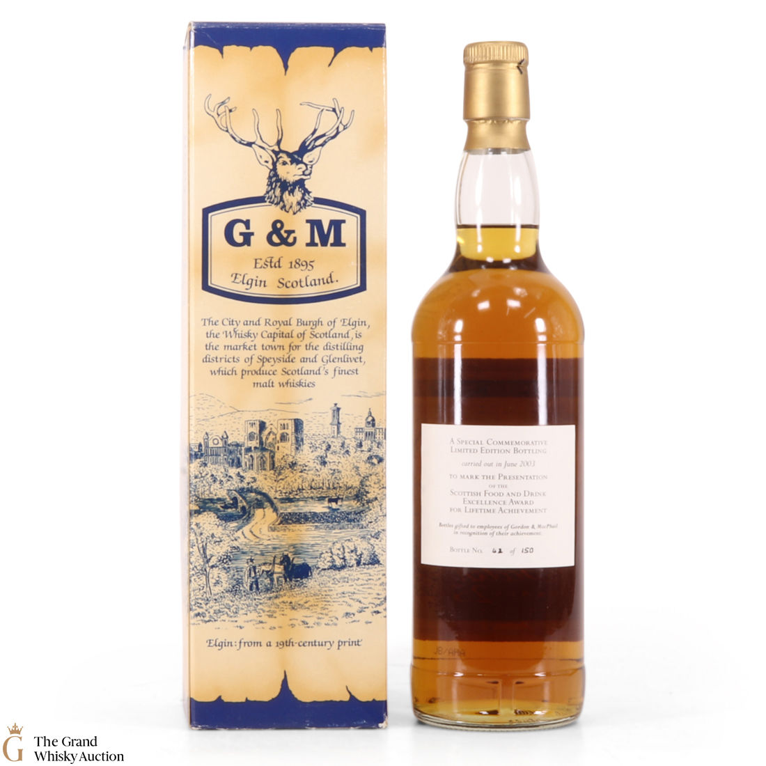 This is a special commemorative bottling carried out in June 2003 to mark the presentation of the Scottish Food & Drink Excellence Award for Lifetime Achievement. This bottle was gifted to employees of Gordon & MacPhail in recognition of their achievement. This is a 25-Year-Old Speyside malt.