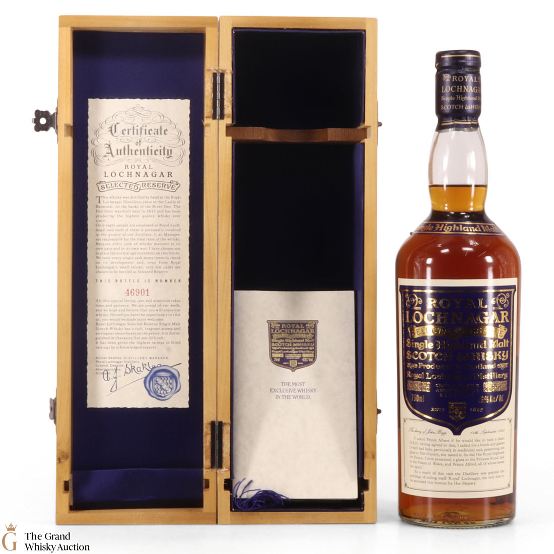 Royal Lochnagar Select Reserve is presented in a wooden case that is lined with a royal blue colour.