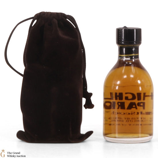 An older style 10cl bottle of 12 Year Old Highland Park, with velvet bag.