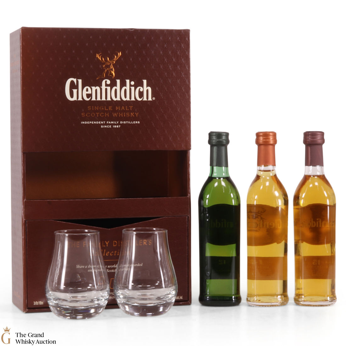 This is a very smart Glenfiddich gift set that includes 3 x 10cl bottles of Glenfiddich and two branded glasses: