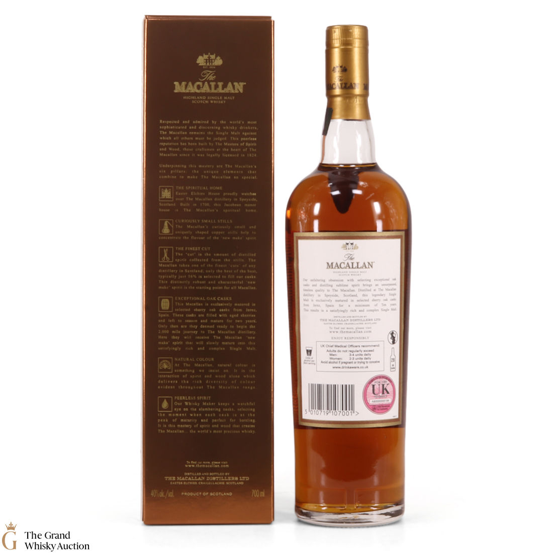 A 10 year old single malt from The Macallan Distillery. It has been exclusively matured in selected sherry oak casks from Jerez, Spain.