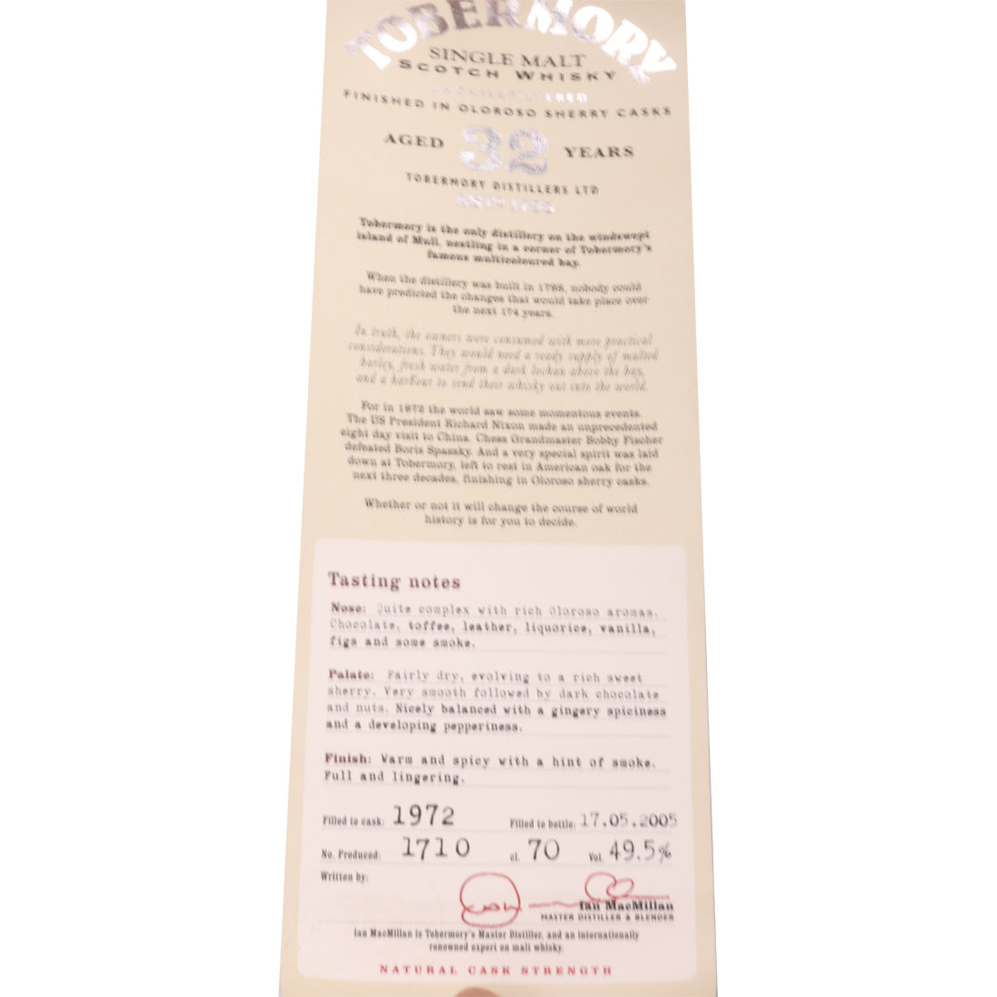 A limited edition 32 Year Old Tobermory from 1972, finished in Oloroso sherry casks for a deliciously rich sweetness. Bottled in 2005, this is one of just 1710 individually numbered bottles produced. This single malt, from the only distillery on the Island of Mull, was bottled at its natural cask strength of 49.5%.