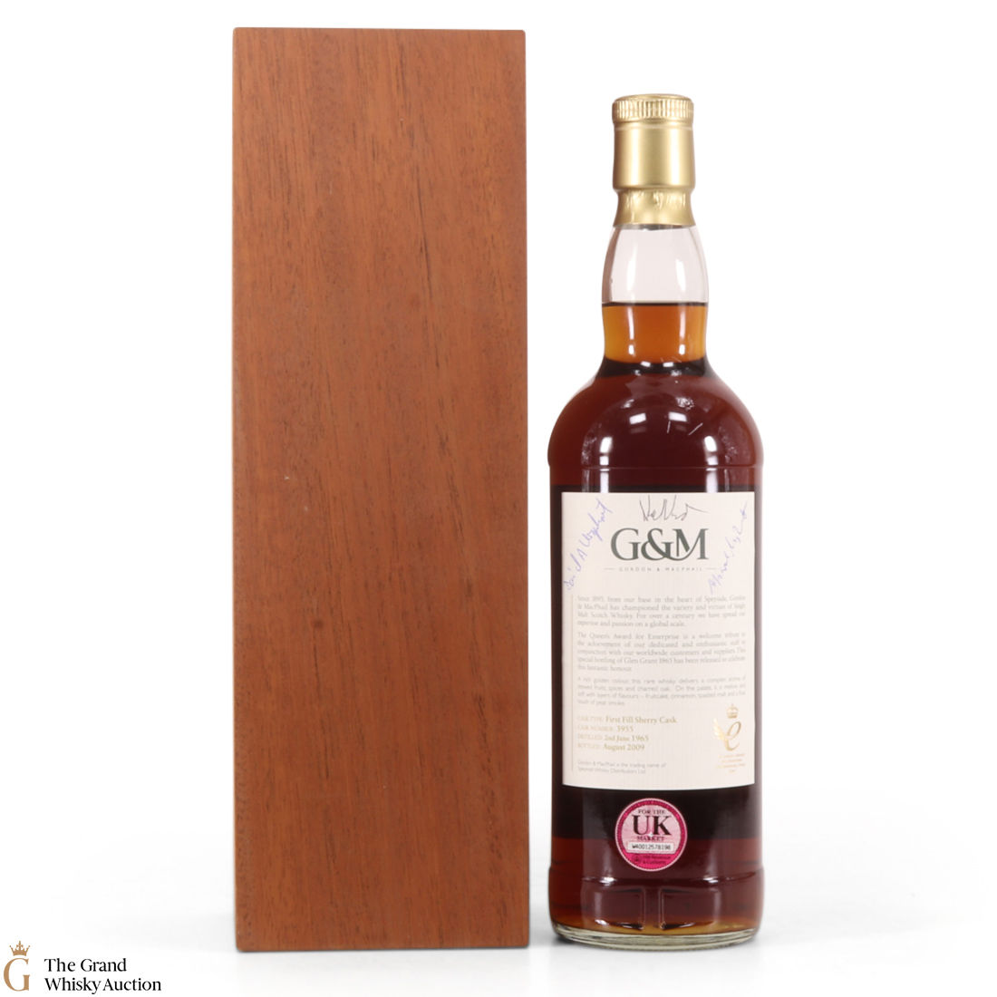 This well-aged Glen Grant was specially bottled to celebrate Gordon & MacPhail being awarded The Queen's Award for Enterprise for International Trade and was given to staff. Distilled in June 1965, it was matured in a first-fill sherry cask and was bottled in August 2009.
