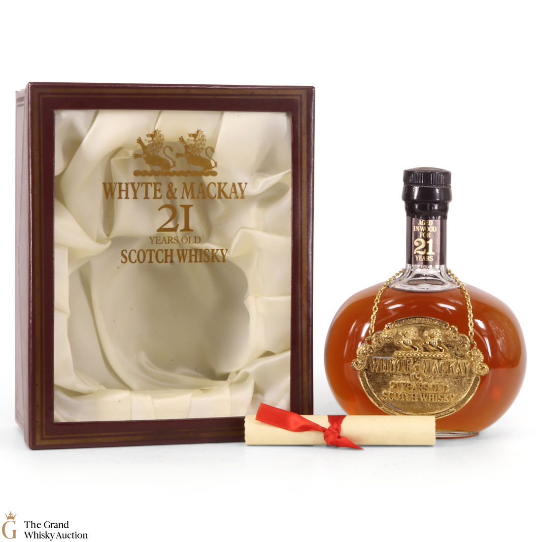 This is a very nicely presented bottle of 21-year-old blended whisky from Whyte & Mackay, which is believed to be produced in the 1980's. The bottle comes with a metallic tag that hangs from the neck of the decanter. It also comes in a beautiful silky lined wooden presentation box.