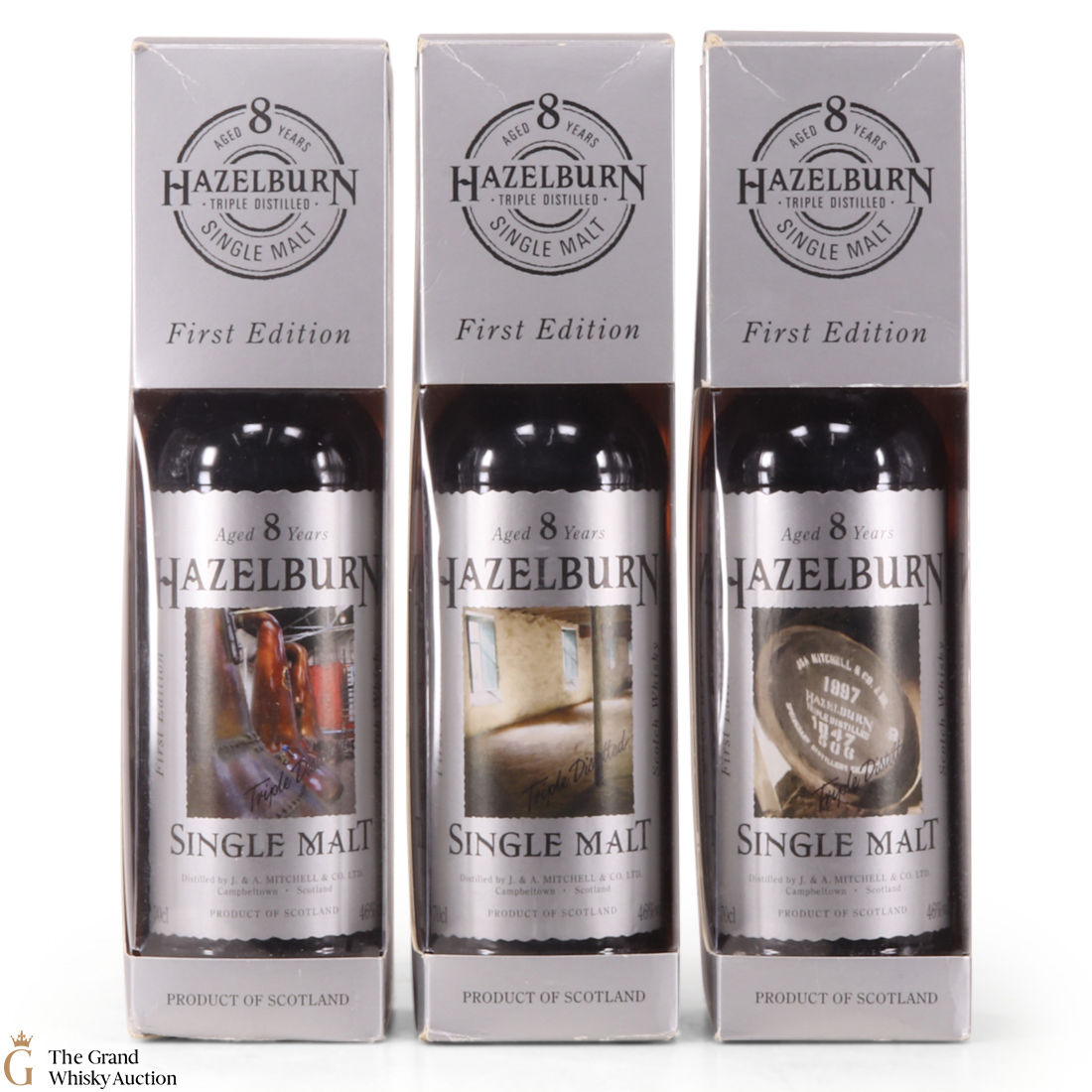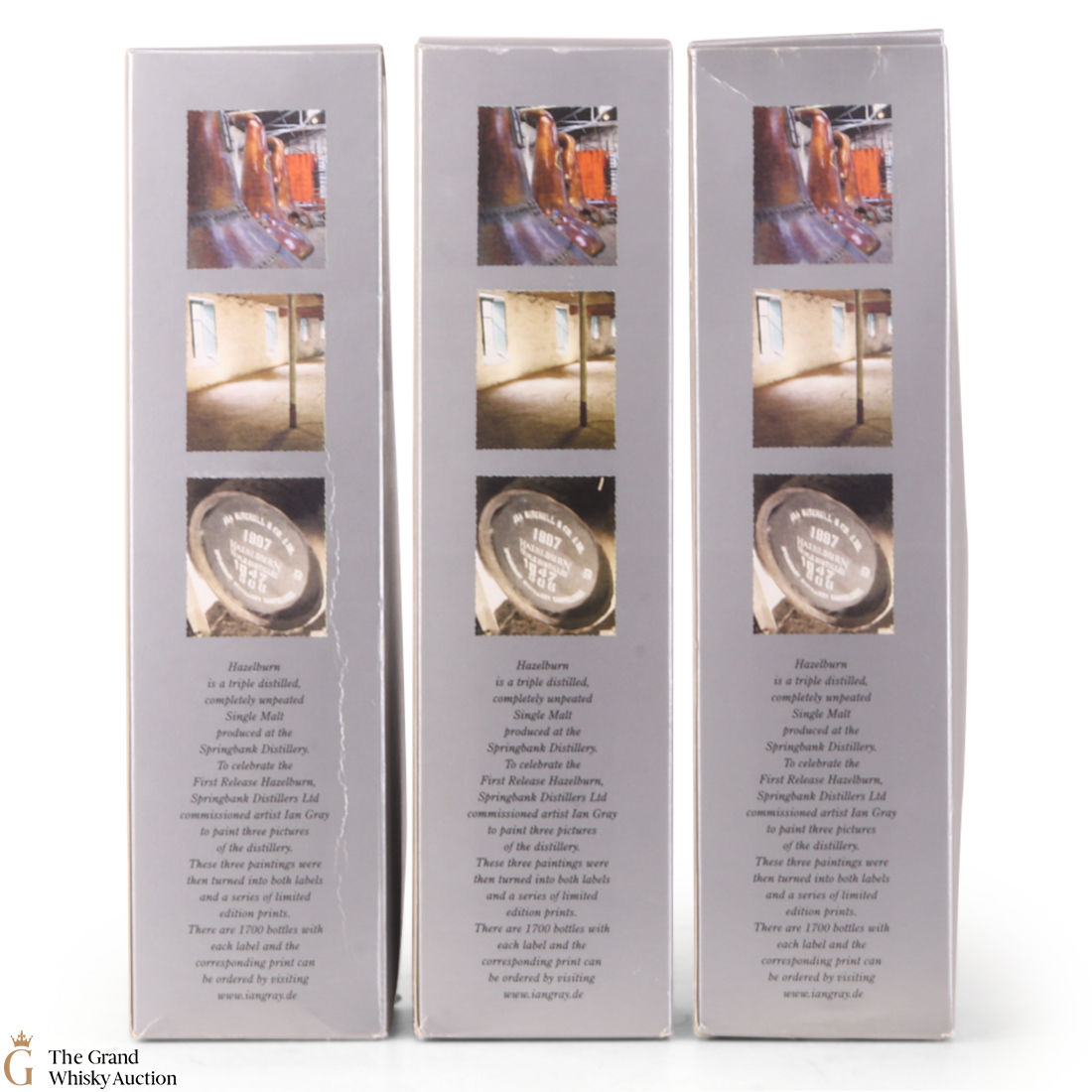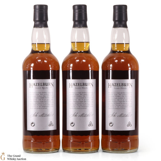 This lot has 3 x 70cl bottles of Hazelburn which is a triple distilled, completley unpeated single malt produced at Campeltown's Springbank Distillery. To celebrate the First Release Hazelburn, Springbank Distillers Ltd commissioned artist Ian Gray to paint 3 pictures of the distillery. These 3 paintings were then turned into both labels and a series of limited edition prints.
