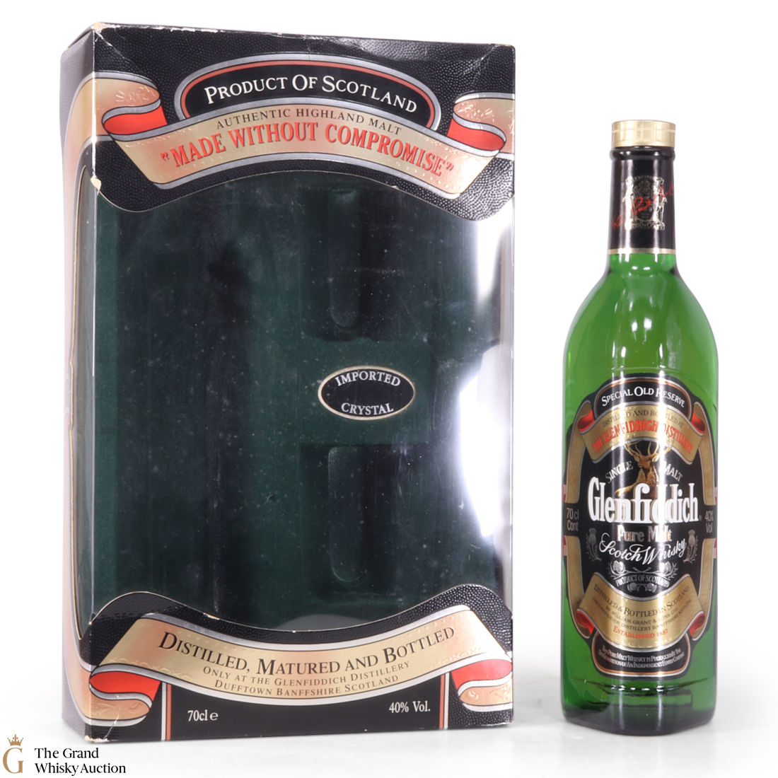 Released to celebrate the distilleries Centenary in 1987, this rare bottle Glenfiddich Pure Malt is becoming increasingly hard to find. It includes two imported crystal glasses.