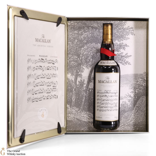 The fourth edition in the Archival Series from The Macallan. Folio 4 remembers the legendary advertising campaigns of the 1970s, 1980s and 1990s that brought The Macallan to the public’s attention outside of Scotland. It is presented in a beautiful book shaped, tin case. It features an advertisement including a Strathspey composed by James Scott Skinner (1843-1927). The advert notes that Skinner was so moved by his favourite malt he created a unique piece of music featuring his signature lilting notes with the simple catchphrase: “The Macallan. The Malt.”
