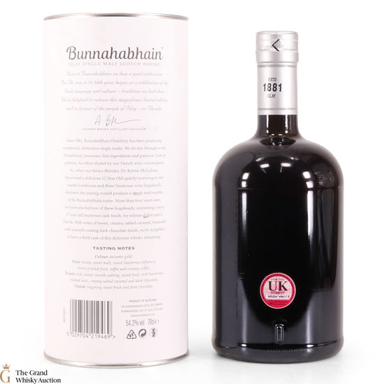 This limited edition single malt from Bunnahabhain Distillery has been matured for 17 years. For the last 5 years, the whisky was finished in Sauternes hogsheads. This release is one of 3 by Bunnahabhain for Fèis Ìle 2019. It has been bottled at 54.2% ABV. This is one of only 1118 bottles produced.